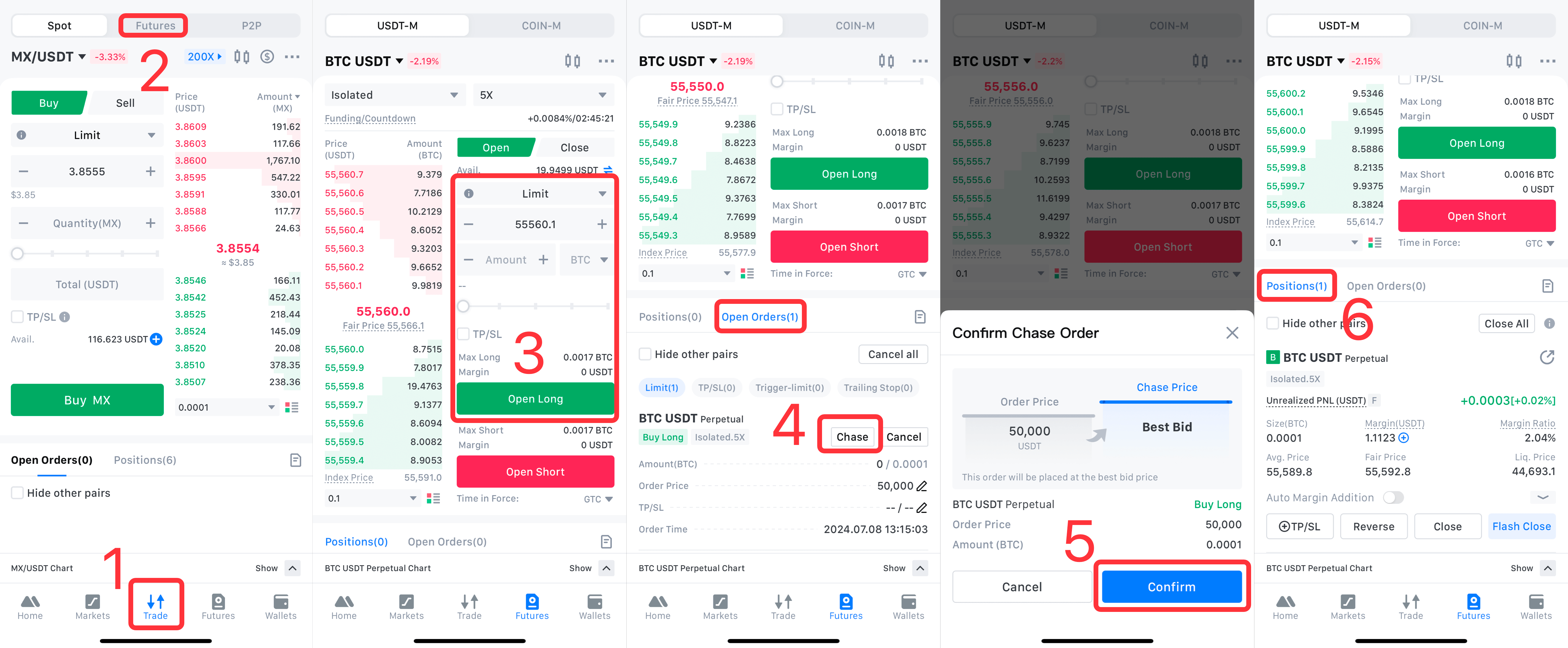 Ang chase order function ay muling nagsusumite ng isang limit order sa kasalukuyang pinakamagandang presyo ng merkado. Partikular, kapag in-activate ng isang user ang MEXC Futures chase order, ang isang umiiral na limit order na malayo sa order book ay mabilis na inaayos sa pinakamagandang bid o ask, habang nananatili pa ring limit order sa Order book. Pinapahintulutan nito ang mga trader na makuha ang mga oportunidad sa gitna ng mabilis na pagbabago ng presyo nang hindi kinakailangang gumamit ng market orders, na karaniwang may mas mataas na bayarin.