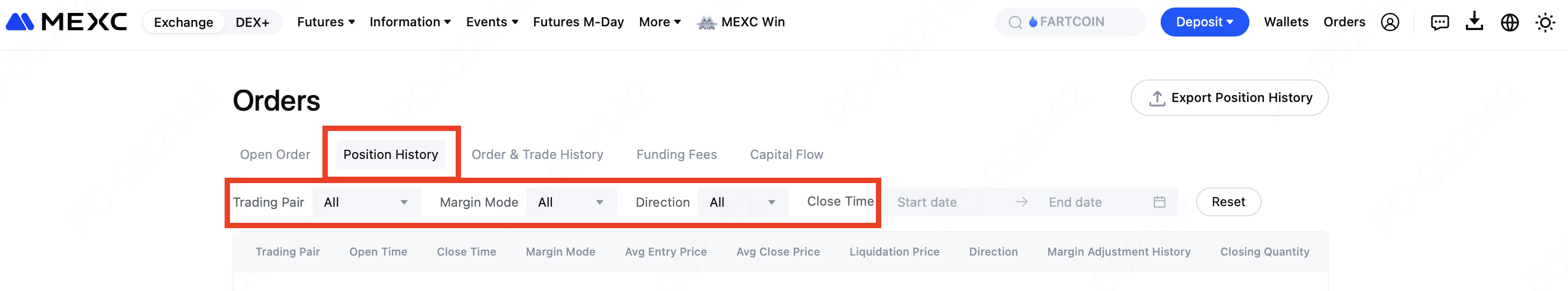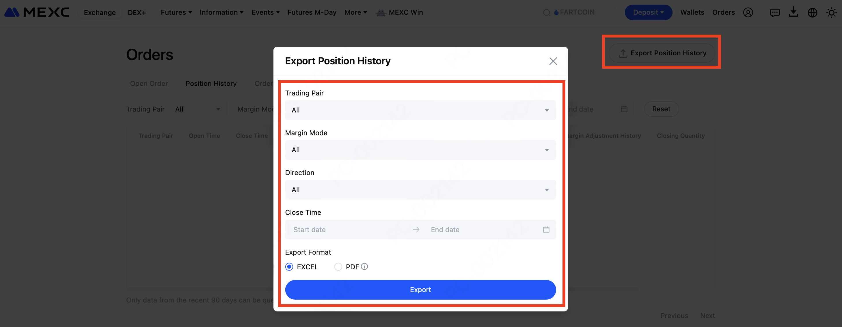 Sa kasalukuyan, sinusuportahan lamang ng MEXC ang pag-export ng data ng kasaysayan ng posisyon ng futures sa Web platform; hindi pa available ang feature na ito sa App.