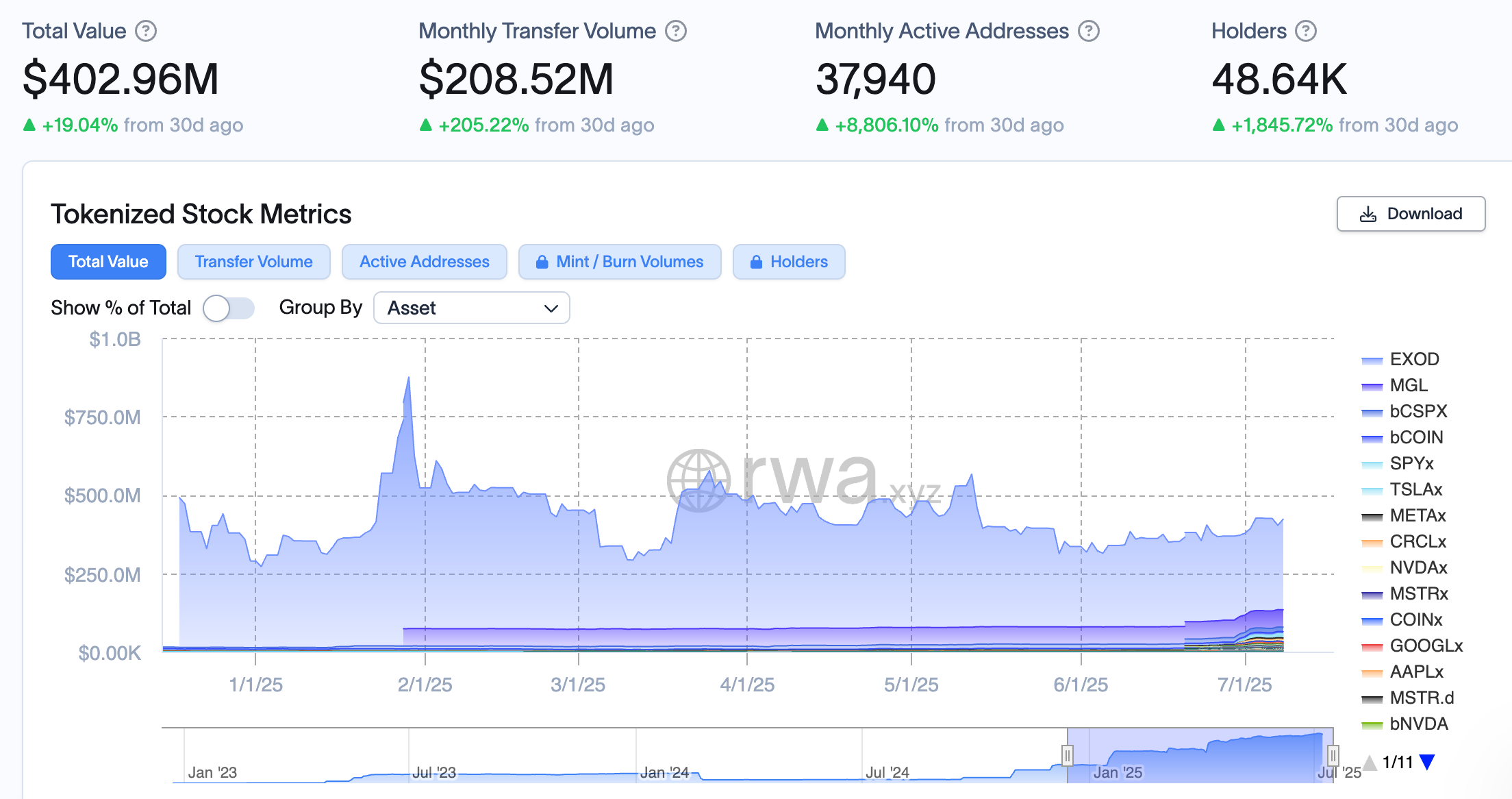 Ayon sa datos mula sa RWA.xyz, patuloy ang paglago ng tokenized stock market mula pa noong unang bahagi ng 2025. Noong Hulyo 9, lumampas na sa $400 milyon ang kabuuang laki ng merkado, at tinatayang maaaring lumago pa ito hanggang sa trilyong dolyar sa hinaharap.