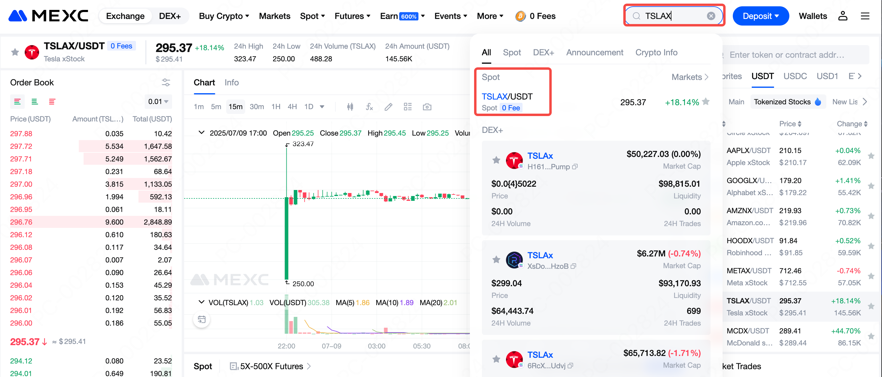 Maaari kang dumiretso sa seksyong Tokenized Stocks at i-click ang button ng Mag-trade upang makapunta sa pahina ng Spot trading. Bilang alternatibo, maaari mo ring i-type ang pangalan ng token (halimbawa, TSLAX) sa search bar upang direktang mapunta sa Spot trading interface nito.