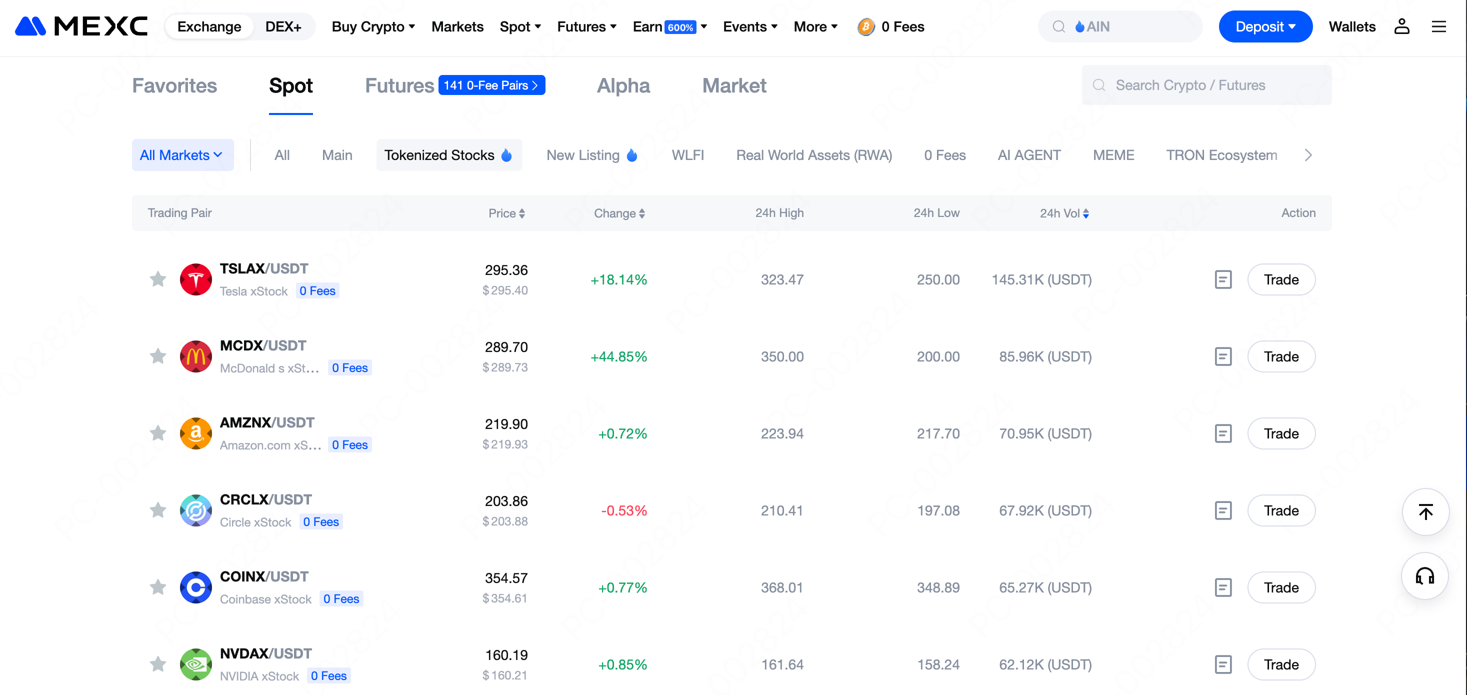 Ang MEXC Spot Trading ay nag-aalok na ngayon ng iba't ibang U.S. tokenized stocks na sinusuportahan ng xStocks, kabilang ang TSLAX, MCDX, AMZNX, CRCLX, COINX, NVDAX, AAPLX, HOODX, GOOGLX, METAX, DFDVX, MSTRX, SPYX, at marami pang iba. Makikita ang mga U.S. stock tokens na ito sa seksyong Tokenized Stocks sa pahina ng Merkado sa MEXC. Sa pamamagitan ng suporta ng MEXC sa tokenized stock trading, mas madaling makakakuha ng access ang mga investor sa mga shares ng kilala at pandaigdigang kumpanya gamit ang USDT, na nagbibigay-daan sa mabilis at flexible na global investment opportunities.
