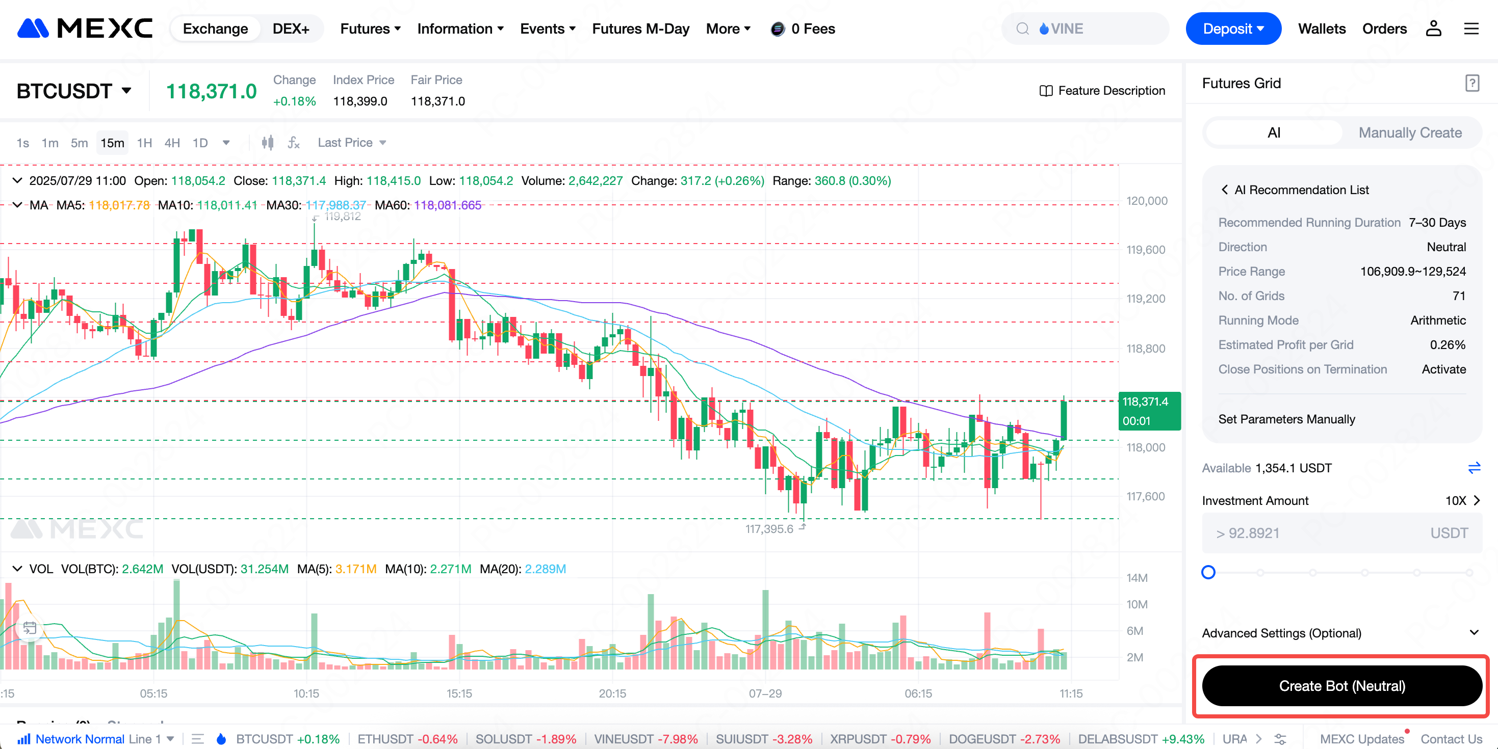 Gumawa ng Grid Bot: Kopyahin ang inirerekomendang diskarte, ilagay ang halaga ng iyong pamumuhunan, at mabilis mong mailunsad ang iyong Futures Grid AI bot.