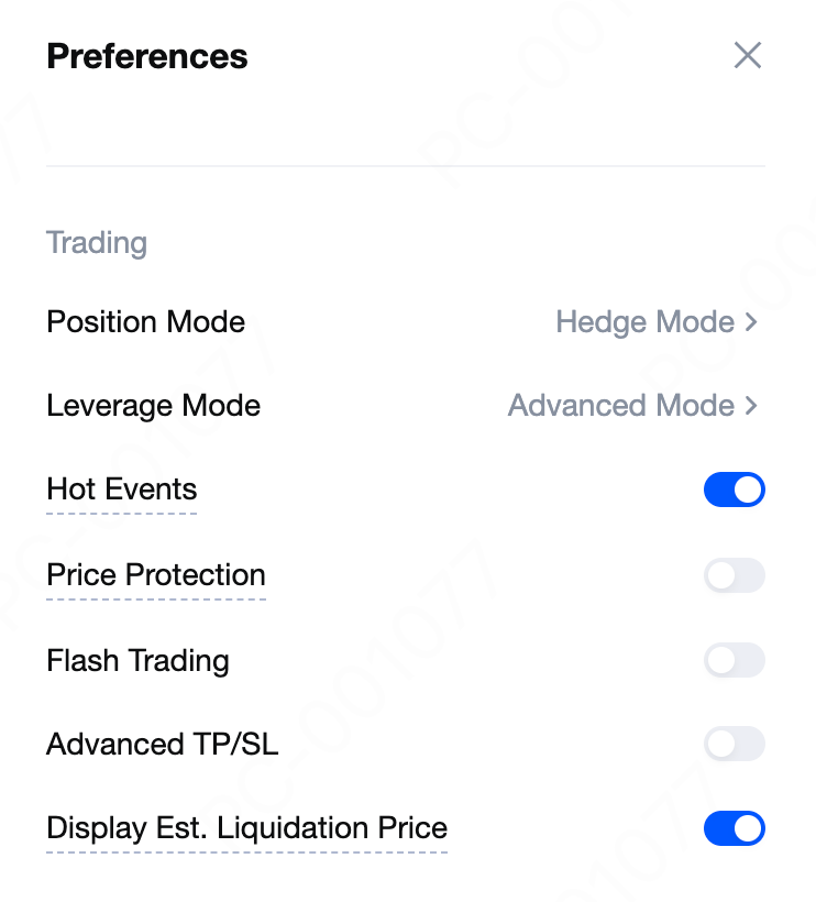 Kasama sa mga setting sa kalakalan ang position mode, leverage mode, spread protection, flash trade, advanced TP/SL, at mga pop-up para sa kumpirmasyon ng order.