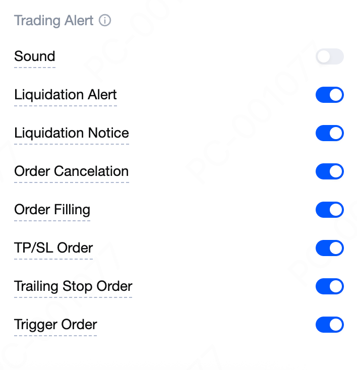 Kasama sa mga alerto sa kalakalan ang sound notifications, mga babala sa liquidation, mga abiso sa likidasyon, order cancellations, order fills, TP/SL triggers, trailing stop, at trigger orders. Kapag naganap ang mga pangyayaring ito, aabisuhan ka ng platform sa pamamagitan ng mga pop-up window sa trading page. Maaari mong piliing paganahin o hindi paganahin ang mga alert na ito, at nalalapat ang mga ito sa lahat ng pares sa Futures.