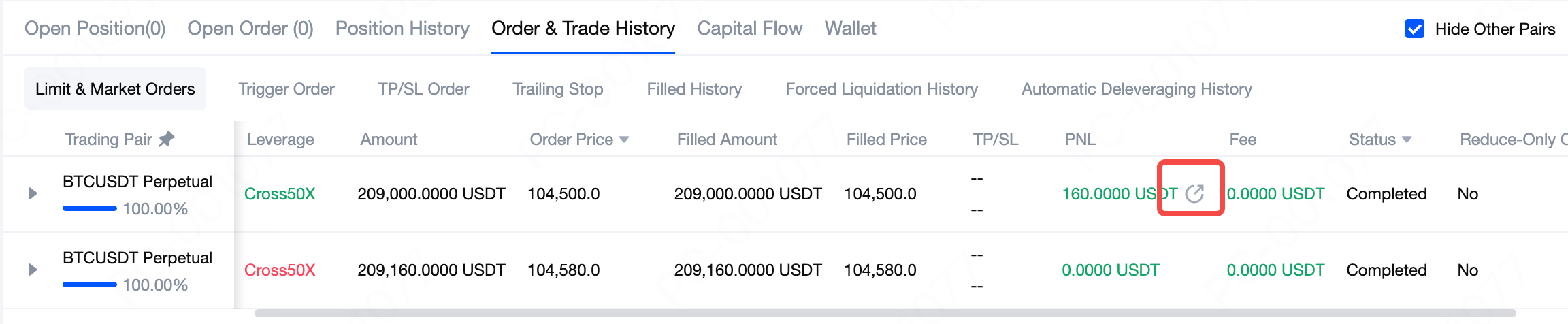 Bilang karagdagan sa seksyong Kasaysayan ng Order sa ibaba ng pahina ng pangangalakal, sinusuportahan na rin ngayon ng candlestick chart ang pagpapakita ng mga talaan ng mga nakaraang order. Sa kasalukuyan, hanggang 100 sa mga pinakahuling napunang order ang ipinapakita.