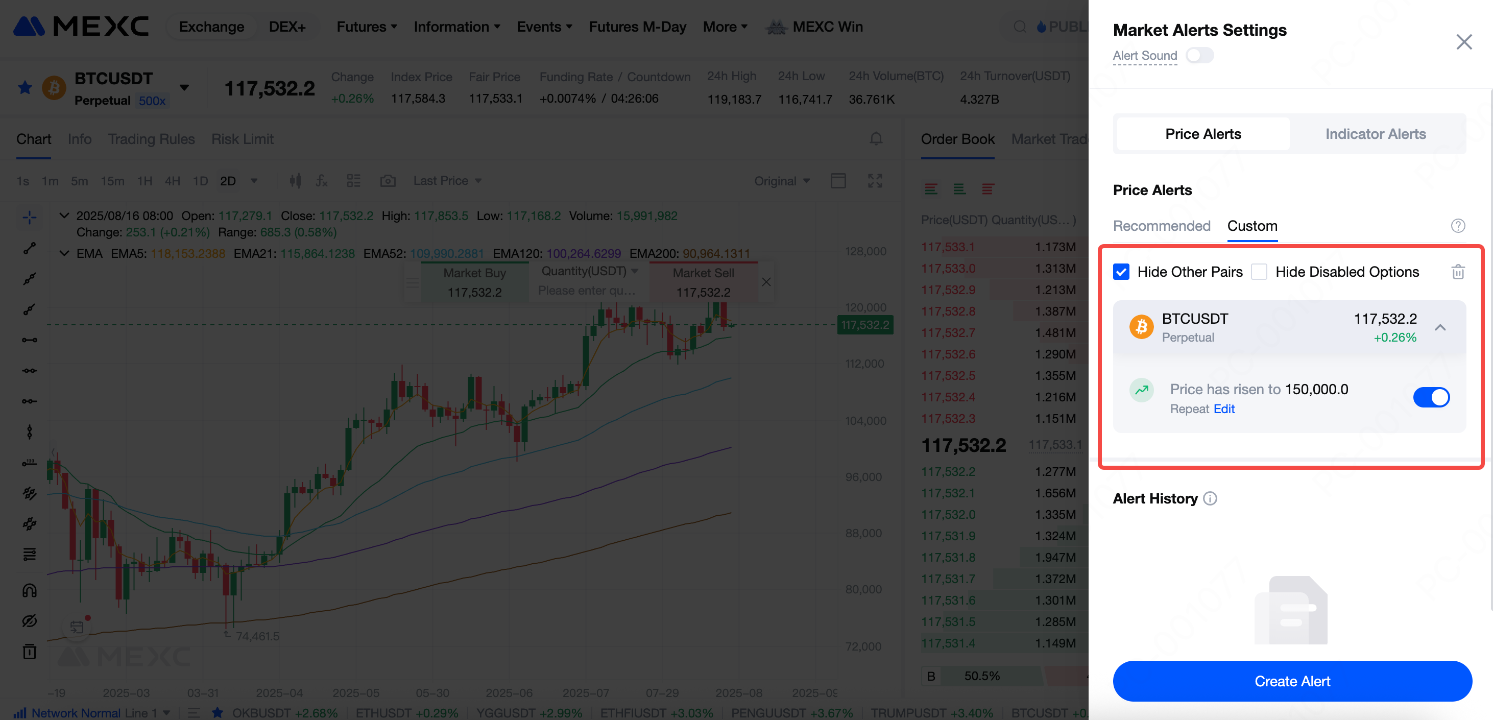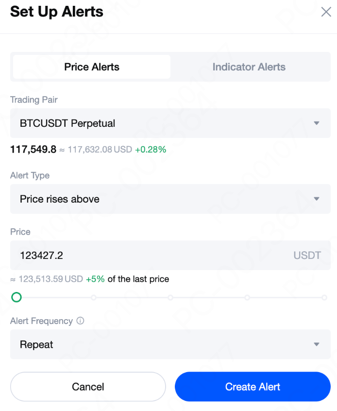 Sa pamamagitan ng pag-click sa button ng Presyo ng Alerto, maaari kang magtakda ng mga parameter gaya ng pares ng kalakalan, uri ng alerto, at dalas ng alerto. Kapag na-configure, i-click ang Lumikha ng Alerto upang makumpleto ang pag-setup.