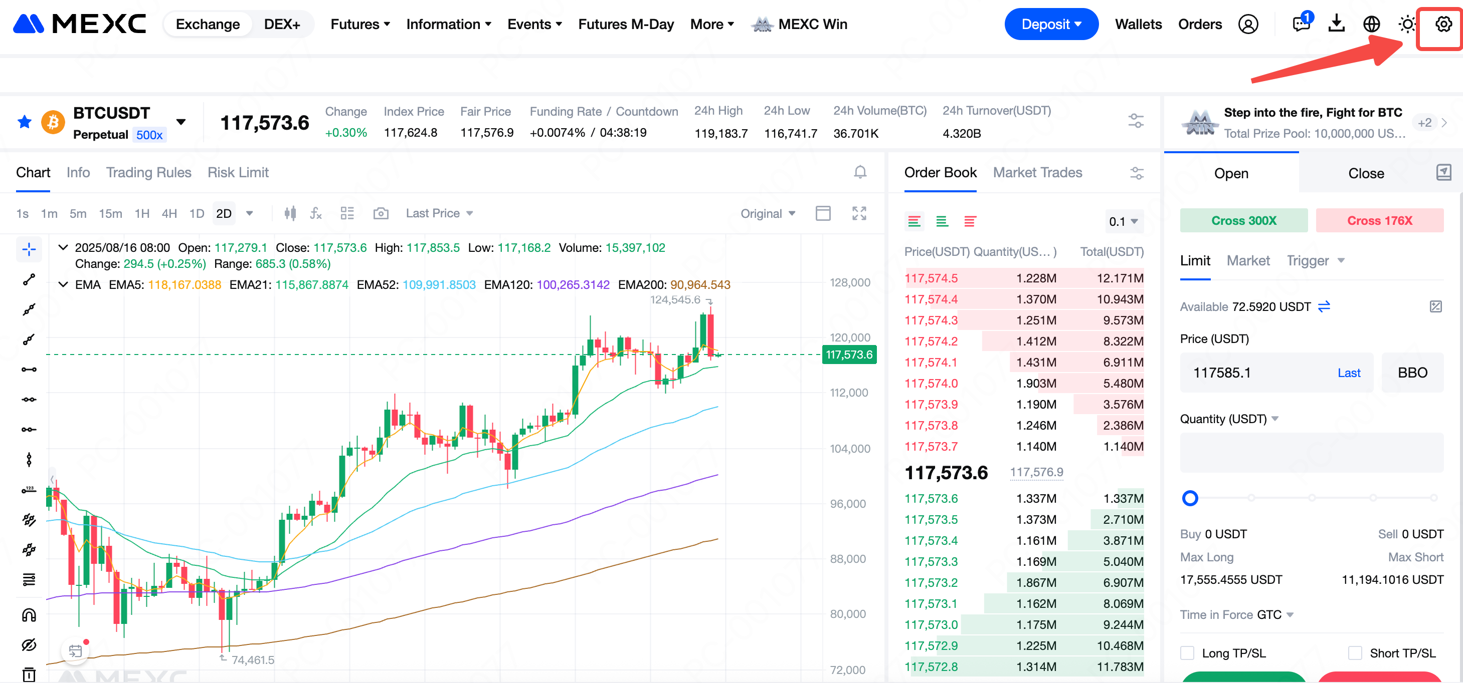 Upang magsimula, mag-log in sa opisyal na MEXC website. Sa Futures trading page, i-click ang ⚙️button sa kanang itaas upang ma-access ang settings page, kung saan maaari mong i-configure ang iba’t ibang pantulong na function na may kaugnayan sa paglalagay ng order.