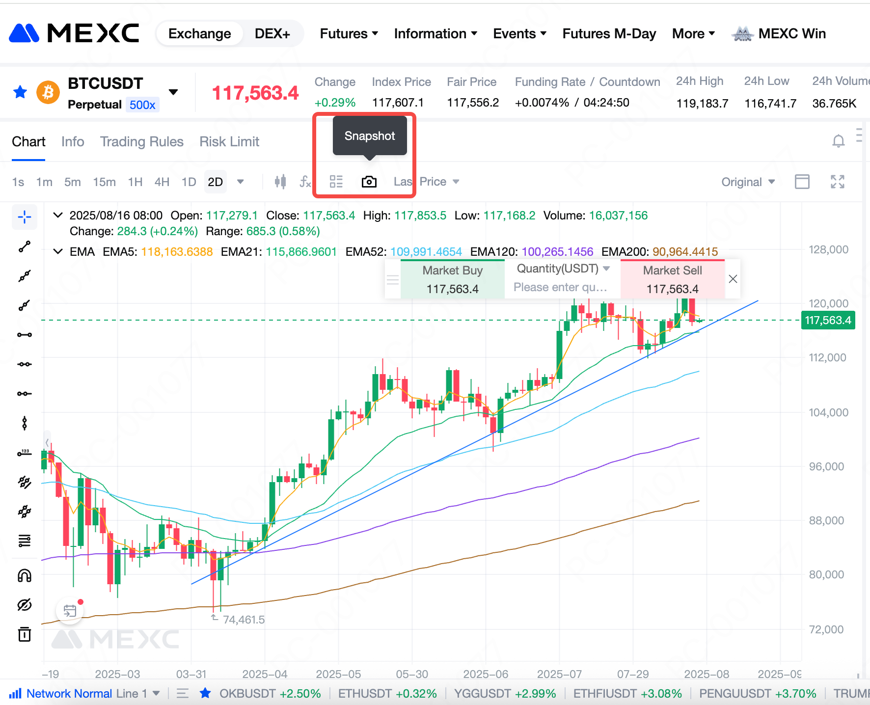 Katulad ng Spot trading, ang tampok na pagbabahagi ng snapshot ay maaaring isama sa tool sa pagguhit. Pagkatapos magmarka ng chart para ipakita ang iyong market outlook, maaari mong i-click ang Snapshot button para bumuo ng isang naibabahaging imahe ng iyong kasalukuyang candlestick chart, na nagbibigay-daan sa iyong mabilis na ibahagi ang iyong market analysis.