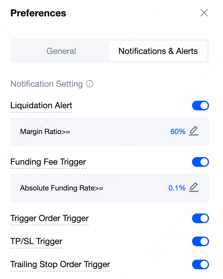 Kasama sa mga setting ng notification ang mga alerto sa liquidation, mga trigger ng bayarin sa pagpopondo, mga order sa pag-trigger, mga trigger ng take-profit/stop-loss, at mga trailing stop na trigger.