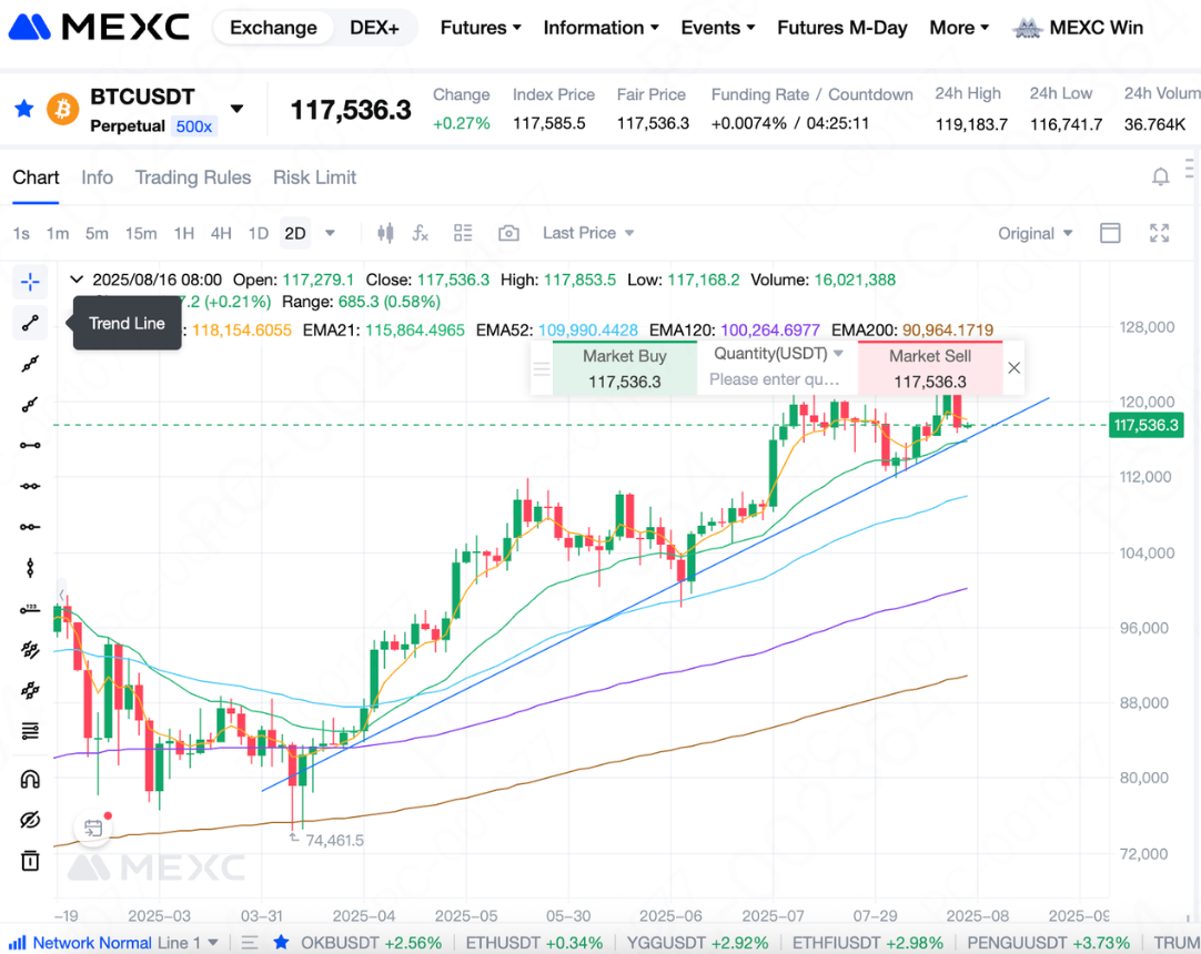 Mas gusto ng maraming karanasang mangangalakal na gumuhit ng mga pantulong na linya sa mga chart ng candlestick upang makatulong na mahulaan ang mga uso sa merkado sa hinaharap. Nag-aalok ang MEXC ng tool sa pagguhit na nagbibigay-daan sa mga user na mabilis na mag-plot ng iba't ibang linya ng propesyonal na pagsusuri, na sumusuporta sa mas mahusay na mga desisyon sa pamumuhunan.