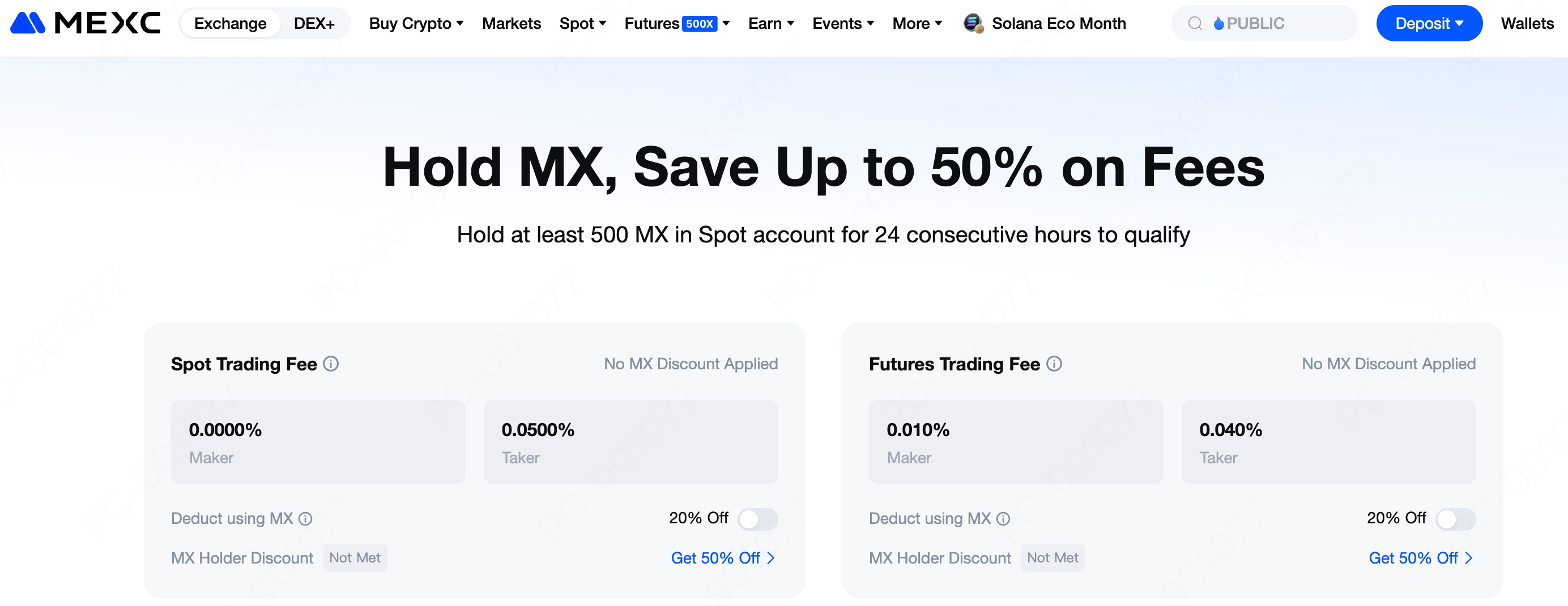 Simula Agosto 16, 2025, ayon sa pinakabagong fee schedule, ang mga regular na user sa MEXC ay nagbabayad ng 0.01% fee para sa Maker orders at 0.04% fee para sa Taker orders kapag nagte-trade ng perpetual Futures. Ang mga user na may hawak na hindi bababa sa 500 MX tokens ay maaari ring makinabang sa karagdagang 50% diskwento. Para sa higit pang detalye, pakitingnan ang opisyal na mga bayarin na nauugnay sa MEXC. Maaaring magbago ang rates depende sa bansa o rehiyon, kaya’t ang pahina ng bayarin ang dapat ituring na pinal na sanggunian.