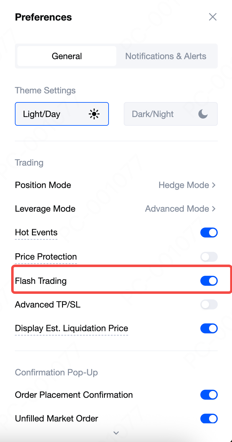 Sa pahina ng Mga Kagustuhan, i-toggle ang switch sa tabi ng Flash Trading upang paganahin ang tampok.