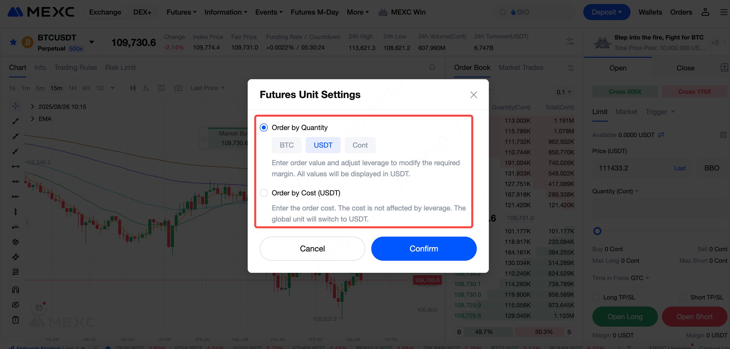 Nagbibigay ang Flash Trading ng apat na magkaibang opsyon ng unit. I-click ang icon na ▼ sa kanan ng Dami (USDT) o Dami (Kont) configuration upang buksan ang window ng Futures Unit Settings. Piliin ang unit na nais mong gamitin at i-click ang Kumpirmahin upang ipatupad ang pagbabago.