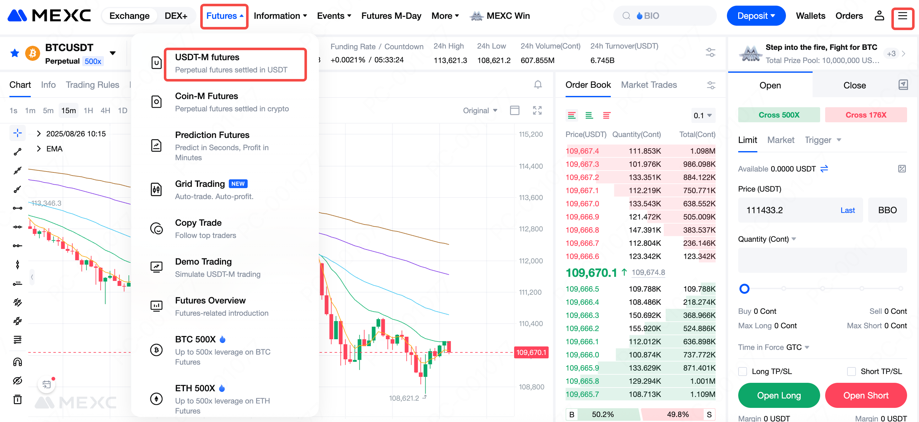Buksan ang opisyal na website ng MEXC at mag-log in sa iyong account. I-click ang Futures → USDT-M Futures upang makapasok sa pahina ng Futures trading. Sa pahina ng trading, i-click ang Mga Setting button sa kanang itaas na bahagi.