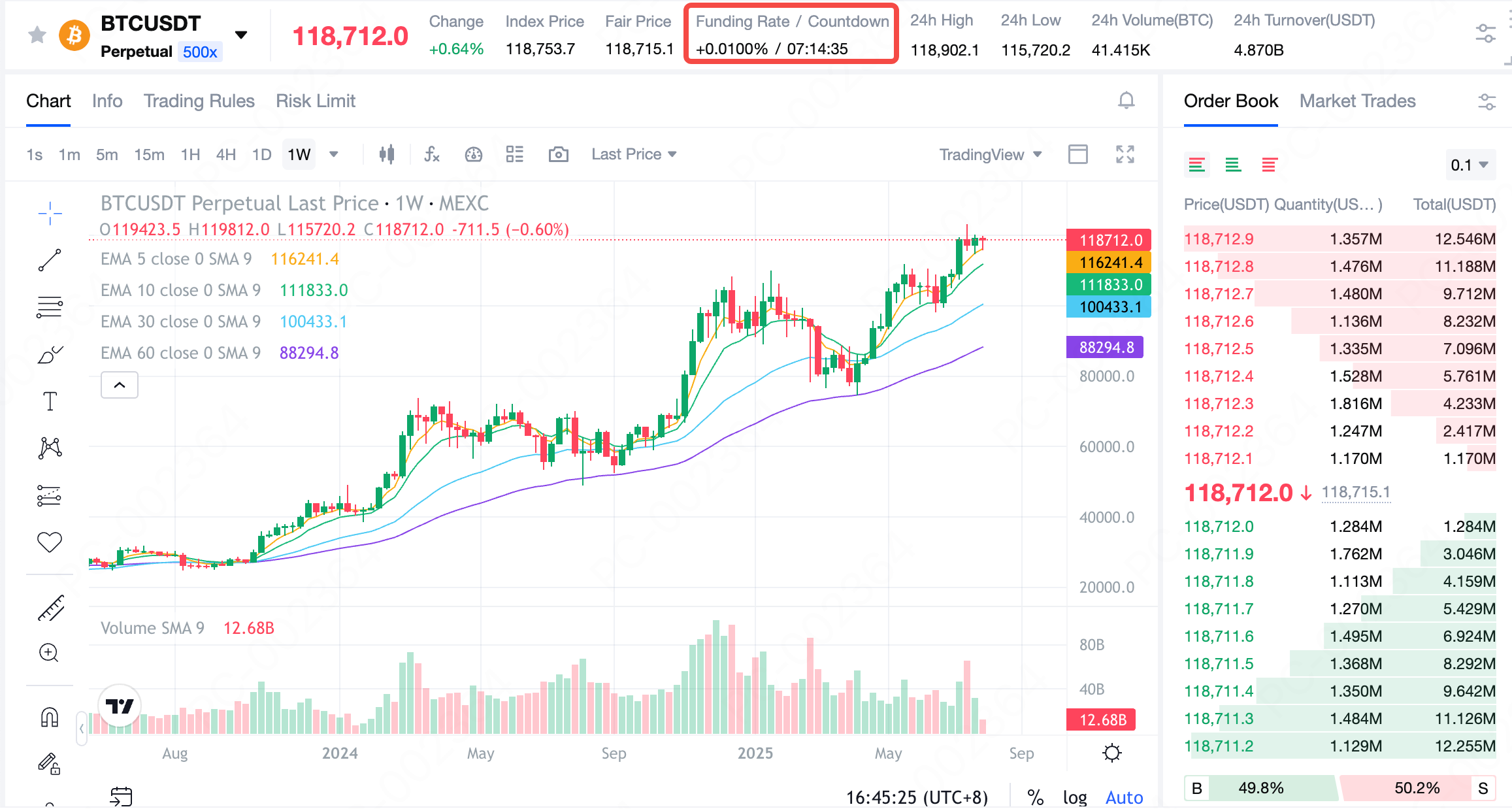 Pinoproseso ng MEXC ang mga bayarin sa pagpopondo sa nakapirming 8 oras na pagitan: 00:00, 08:00, at 16:00 UTC araw-araw.