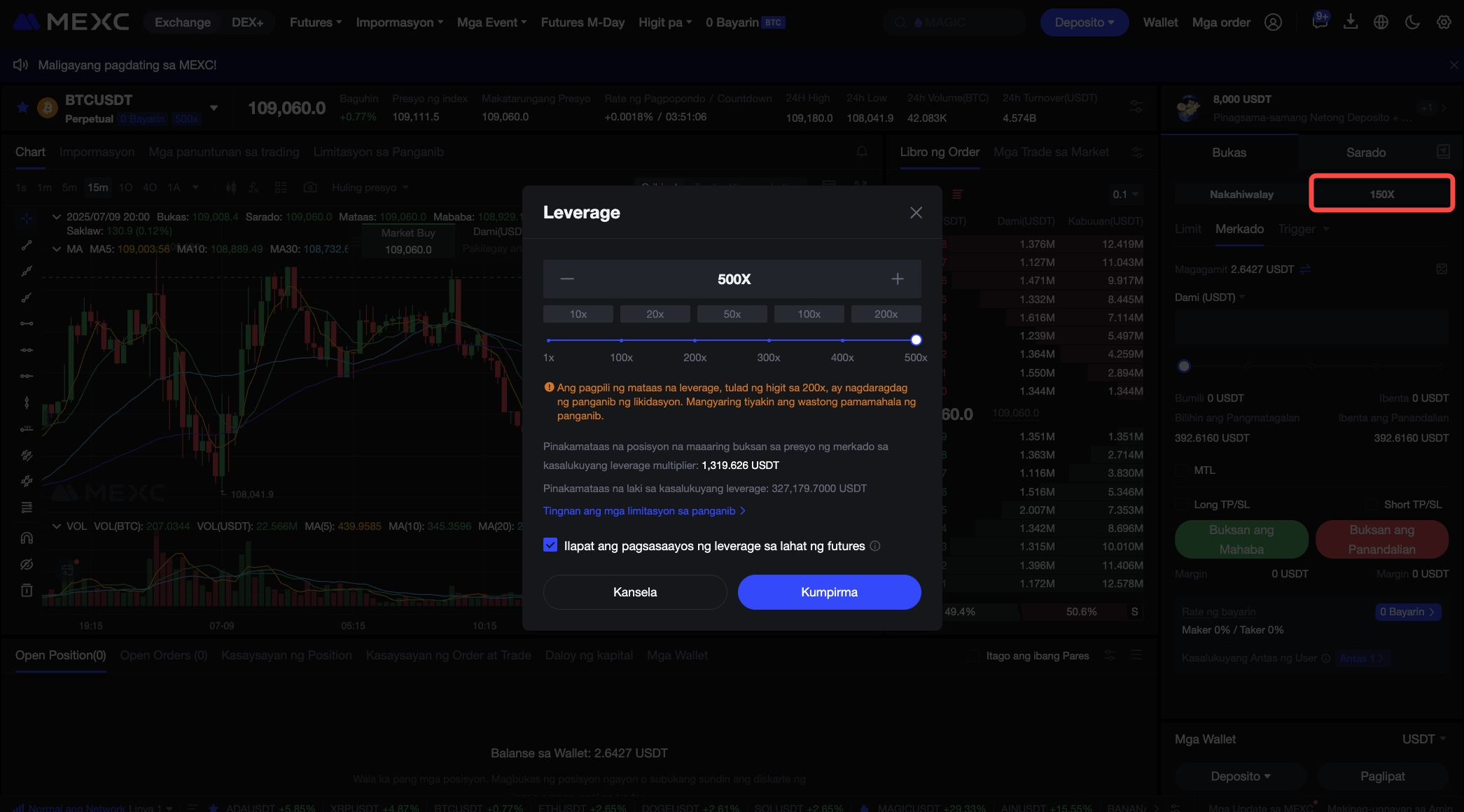 Ang mataas na leverage ay isang tool para sa pagpapahusay ng kahusayan ng kapital, partikular na kapaki-pakinabang sa mga pangunahing crypto market tulad ng BTC at ETH, kung saan ang pagbabago-bago ng presyo ay medyo katamtaman. Kapag ang mga trader ay may mahusay na natukoy na estratehiya at mabilis na makakakilos sa mga panandaliang paggalaw ng merkado, ang mataas na leverage ay makakatulong na i-maximize ang kita kahit sa maliit na hanay ng presyo. Kasalukuyang sinusuportahan ng MEXC ang leverage na hanggang 500x sa mga pangunahing Futures pair tulad ng BTCUSDT at ETHUSDT, na nag-aalok ng mas malaking flexibility para sa mga bihasang user.