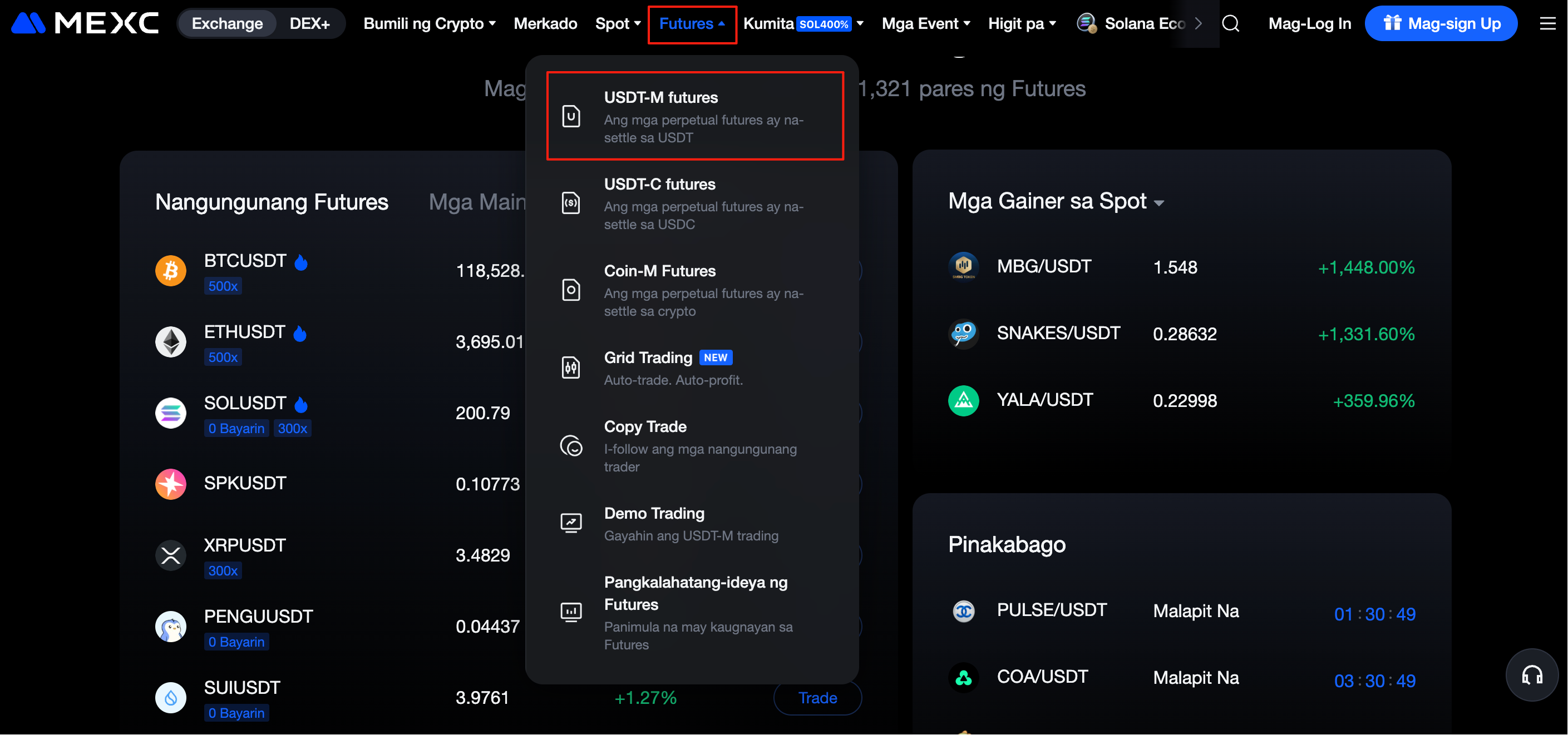 Pagkatapos mag-log in sa iyong MEXC account, i-click ang Futures sa itaas ng pahina at piliin ang USDT M-Futures upang makapasok sa pahina ng Futures trading.