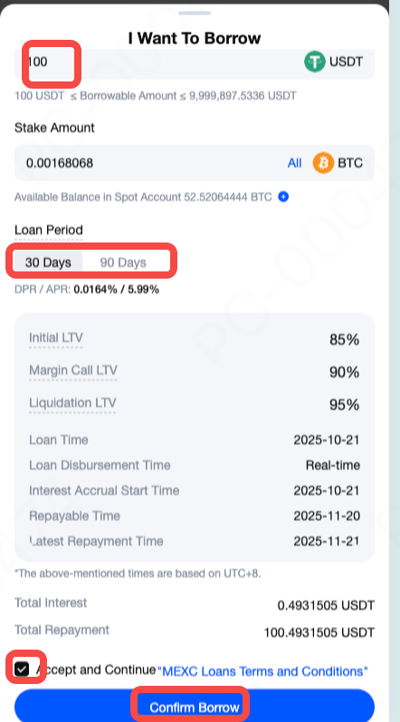 Ilagay ang nais na halaga ng pautang sa USDT, at ang katumbas na dami ng BTC na kailangan mong ipangako ay ipapakita sa pahina. Piliin ang tagal ng pautang, lagyan ng check ang kahon upang sumang-ayon sa "Mga Tuntunin at Kundisyon ng Pautang sa MEXC," at i-tap ang Kumpirmahin ang Paghiram.