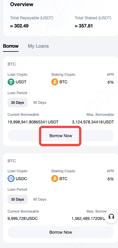 Sa pahina ng Pautang sa MEXC, makikita mo ang kasalukuyang sinusuportahang collateral at loan na mga cryptocurrencies. Para sa mga layunin ng demonstrasyon, ipapangako namin ang BTC para humiram ng USDT. I-tap ang Humiram Ngayon.