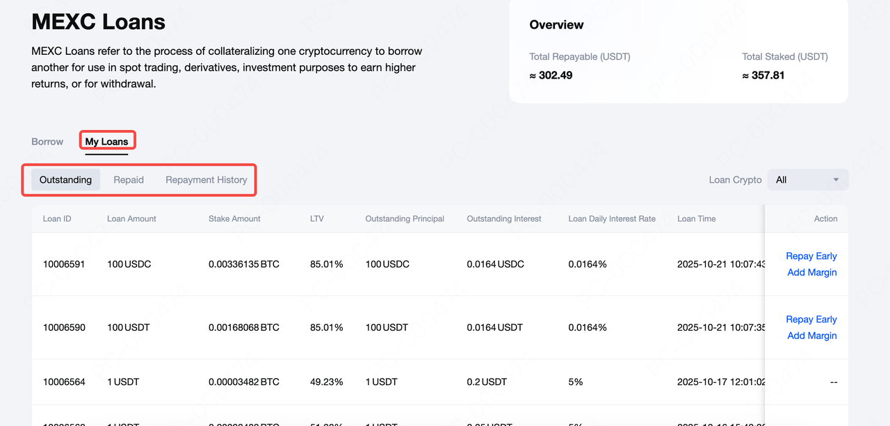 Mahalagang tandaan na dapat mong bigyang-pansin ang panahon ng iyong pautang at bayaran ang utang sa loob ng deadline ng pagbabayad pagkatapos itong mag-expire; kung hindi, magkakaroon ng overdue na interes. Sa kasalukuyan, pinapayagan ng Pautang sa MEXC ang maagang pagbabayad nang walang anumang mga parusa.