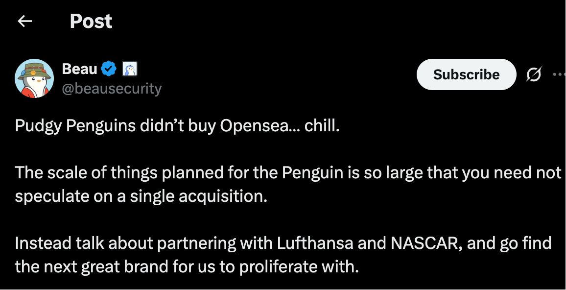Noong huling bahagi ng Hulyo, kumalat sa social media ang mga bulung-bulungan na binibili umano ng Pudgy Penguins ang NFT marketplace na OpenSea. Noong Hulyo 26, diretsahang sinagot ng Head of Security ng Pudgy na si Beau ang mga tsismis: “Hindi binili ng Pudgy Penguins ang OpenSea… chill,” at muling iginiit na ang pokus ng kanilang team ay nasa mga pakikipag-partner, hindi sa pagbili ng ibang kumpanya. Ang resulta ng media buzz na ito ay lumikha ng positibong epekto para sa parehong floor price ng NFT at token na PENGU.