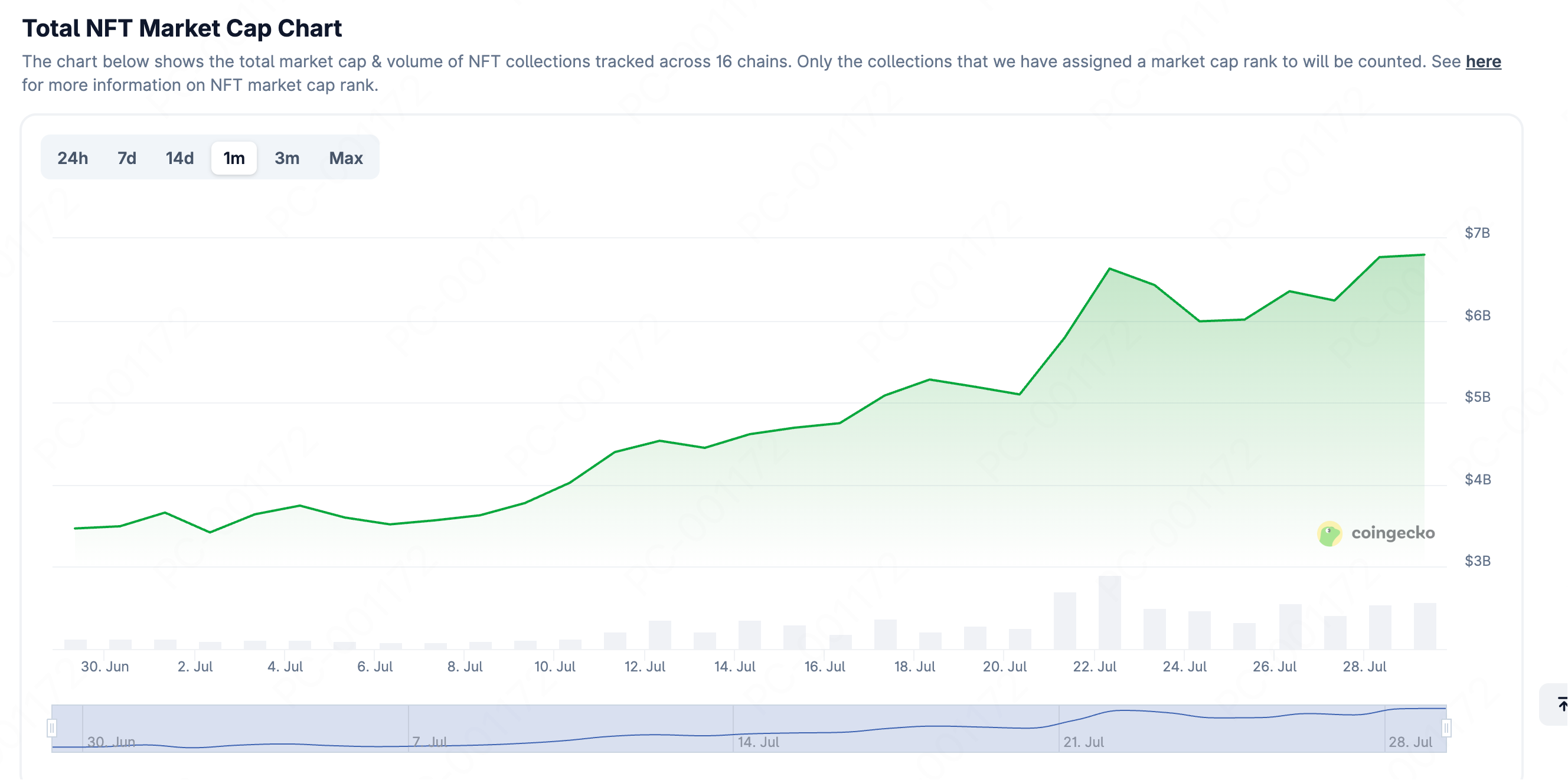 Matapos dumaan sa pagbagsak ng merkado noong 2022 at 2023, ang sektor ng NFT ay nakakita ng malakas na muling pagkabuhay noong 2025. Ayon sa datos mula sa Coingecko, ang kabuuang NFT market cap ay lumampas sa $6.8 bilyon sa loob ng 24 na oras, na may makabuluhang pagtaas ng aktibidad ng kalakalan at isang malinaw na pagbabagong-buhay sa sentimento sa merkado. Sa gitna ng muling pag-angat na ito ay ang blue-chip NFT project na Pudgy Penguins, na naging hindi matatawarang sentro ng atensyon.