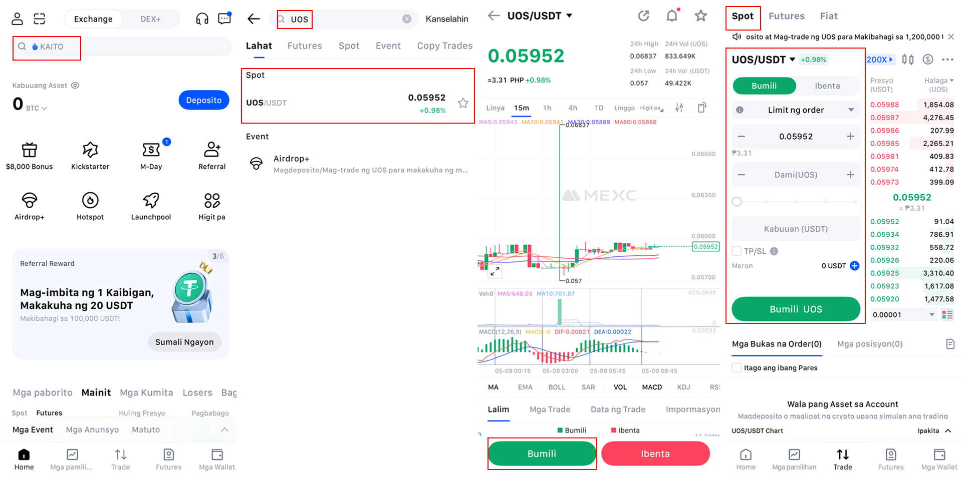 2) Gamitin ang search bar upang mahanap ang "UOS" at piliin ang pares ng kalakalan sa Spot. 3) Piliin ang uri ng iyong order, ilagay ang nais na dami at presyo, at kumpletuhin ang iyong transaksyon.