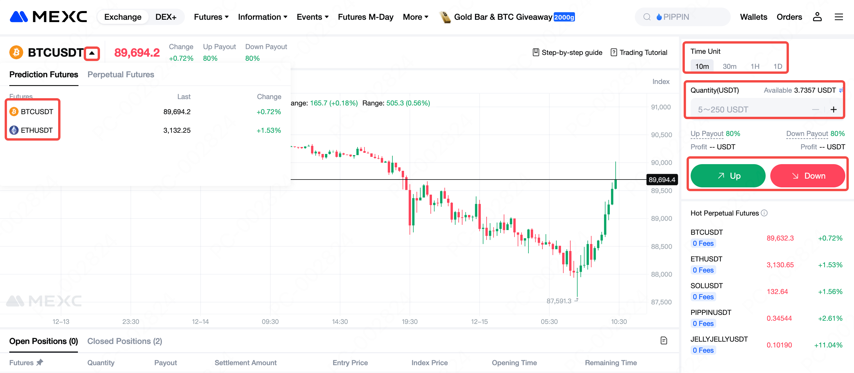 Mag-log in sa iyong MEXC account at pumunta sa pahina ng trading ng Prediction Futures. Piliin ang pares ng kalakalan na gusto mo, gaya ng BTCUSDT. Piliin ang yunit ng oras ng pag-expire (mga opsyon ay 10 minuto, 30 minuto, 1 oras, o 1 araw). Ilagay ang Dami ng Order, pagkatapos ay piliin kung inaasahan mong gagalaw ang presyo Pataas o Pababa sa oras ng pag-expire. Sa huli, i-click ang Kumpirmahin upang isumite ang iyong trade.