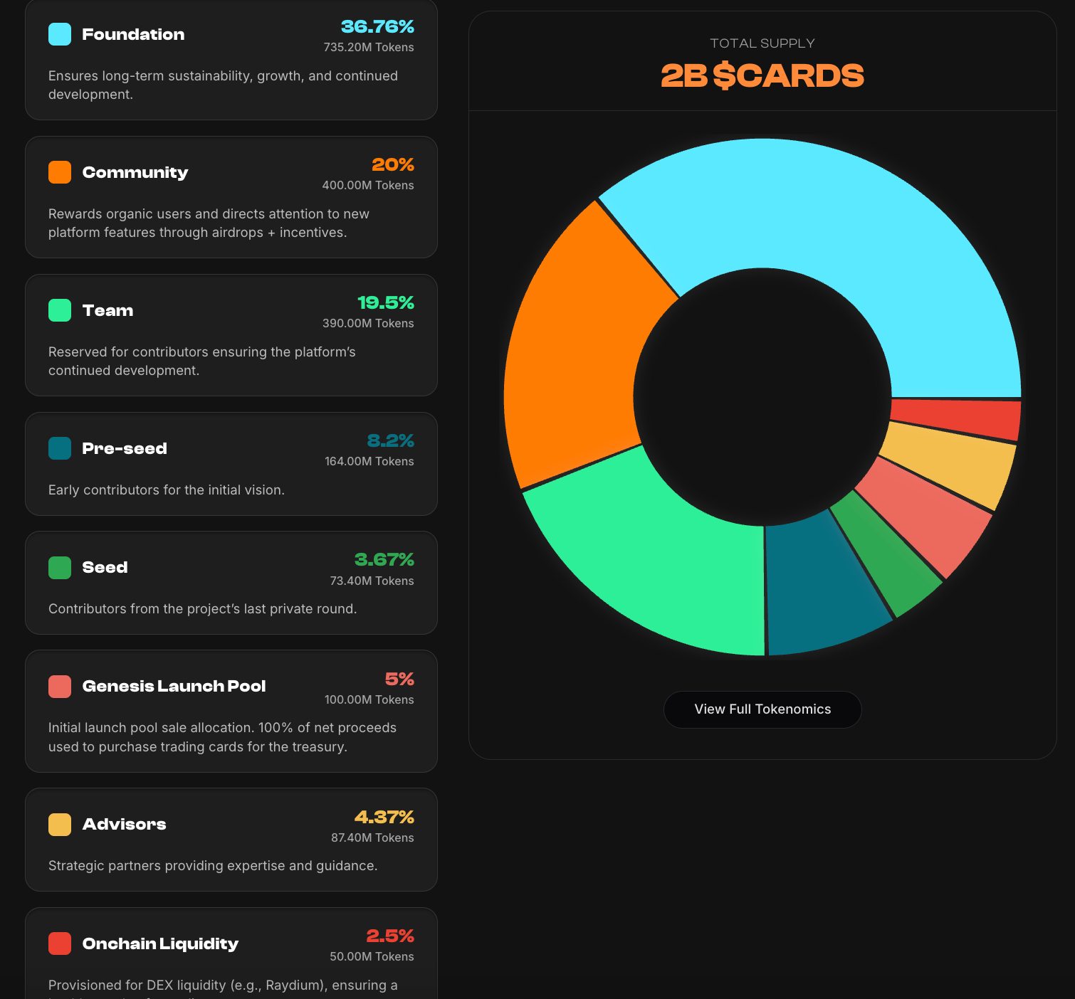 TGE Public Sale | 5.00% | Paglalaan ng pampublikong pagbebenta. Ang lahat ng netong nalikom ay ginagamit sa pagbili ng mga trading card para sa treasury. |