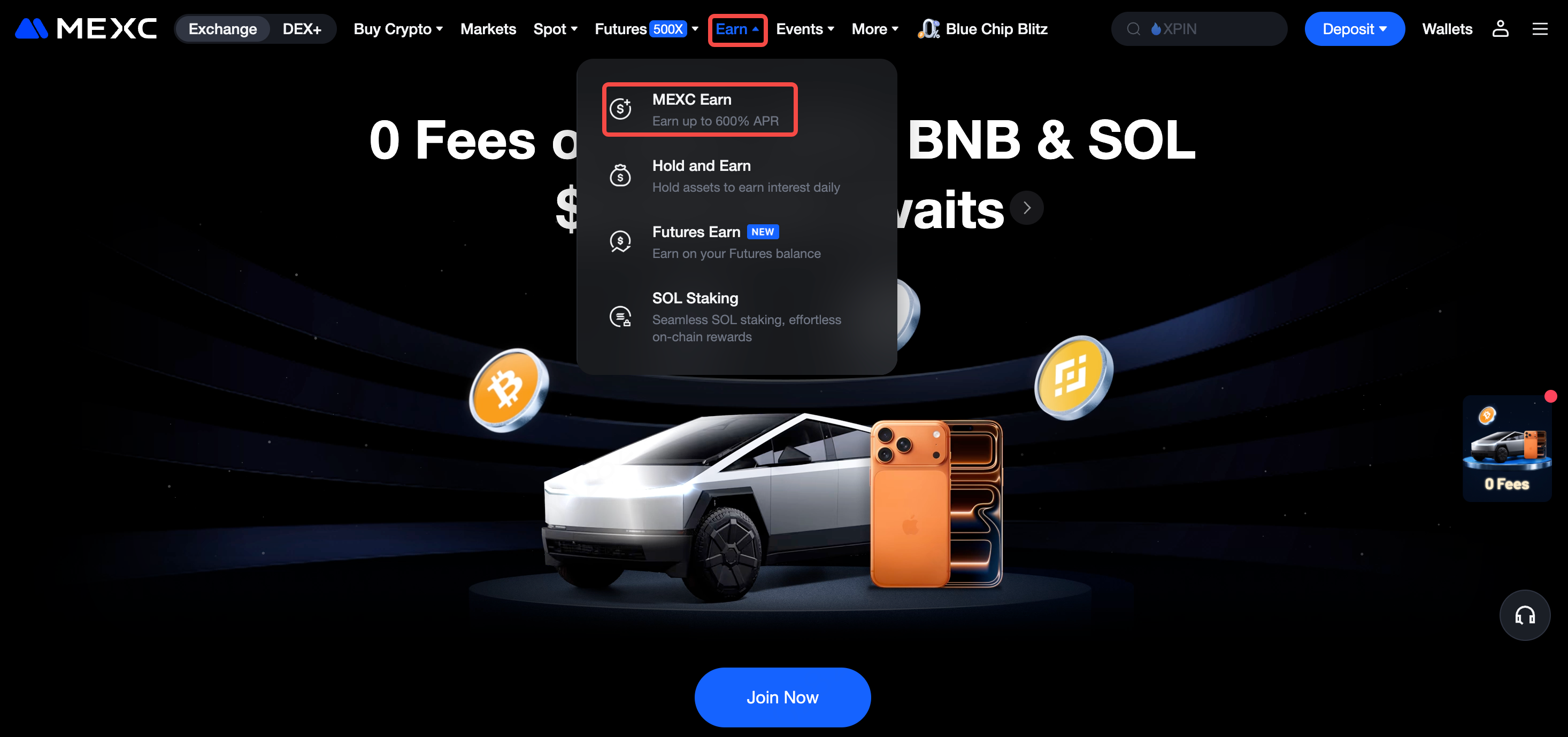 Bisitahin ang opisyal na website ng MEXC at mag-log in sa iyong account. Mula sa itaas na navigation bar, piliin ang Earn at i-click ang MEXC Earn.