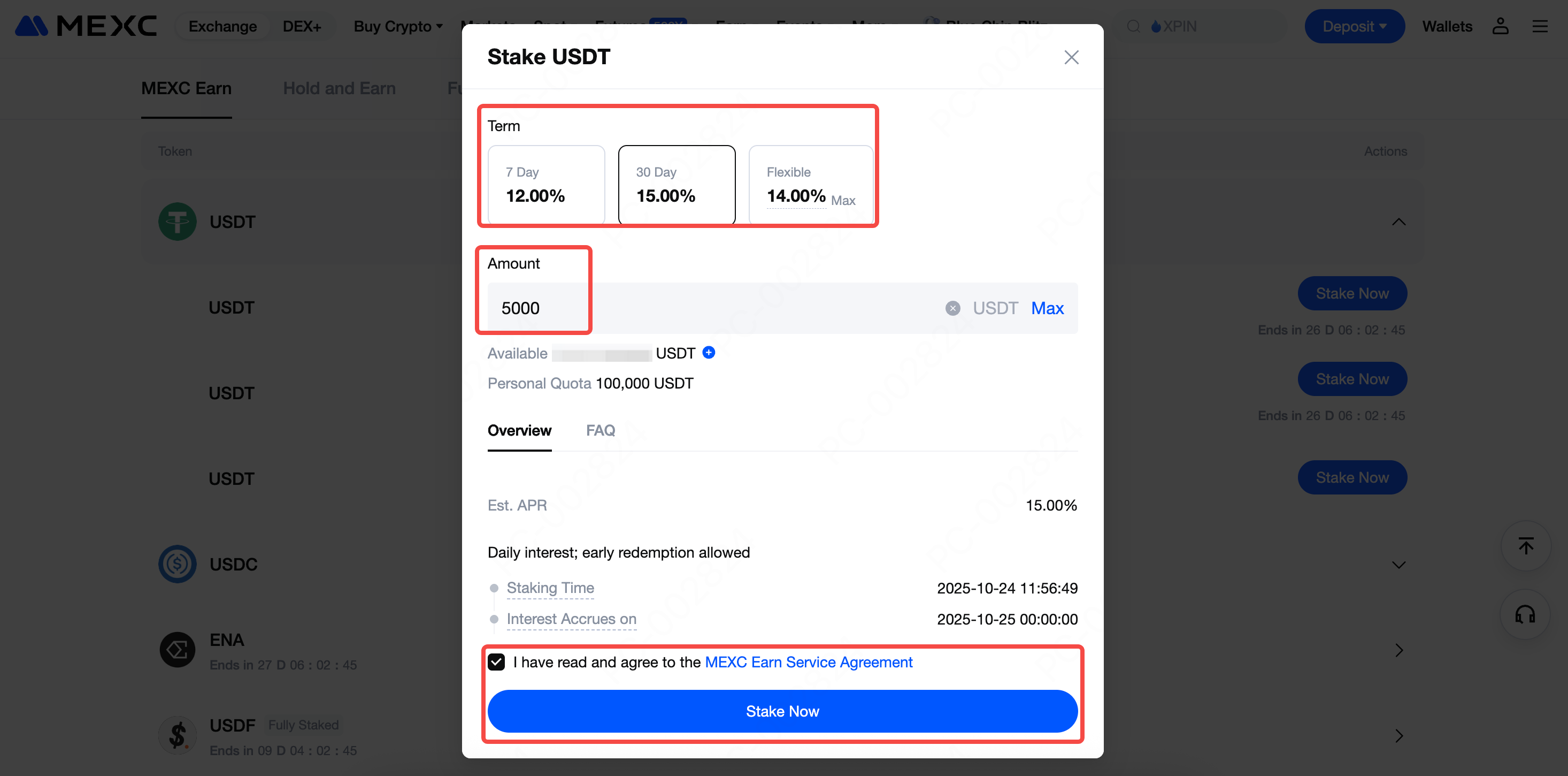 Pagkatapos piliin ang Earn product na nababagay sa iyo, piliin ang investment term sa pahina ng staking, ilagay ang halaga ng pag-stake, sumang-ayon sa mga tuntunin, at i-click ang I-stake Ngayon para lumahok sa MEXC Earn.
