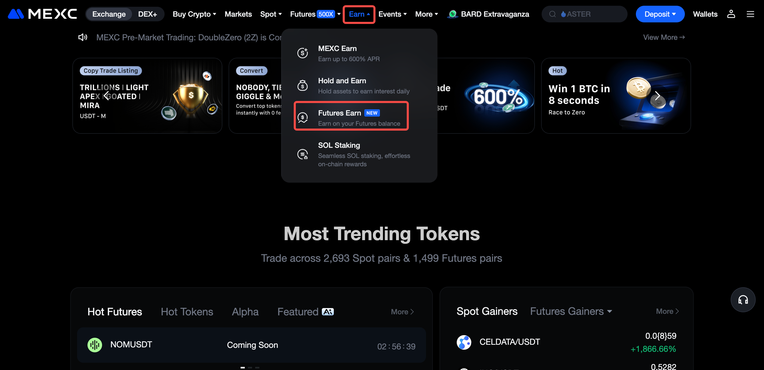 Pumunta sa MEXC opisyal na website homepage at mag-log in. Mula sa Earnmenu, i-click ang Futures Earn para makapasok sa event page.