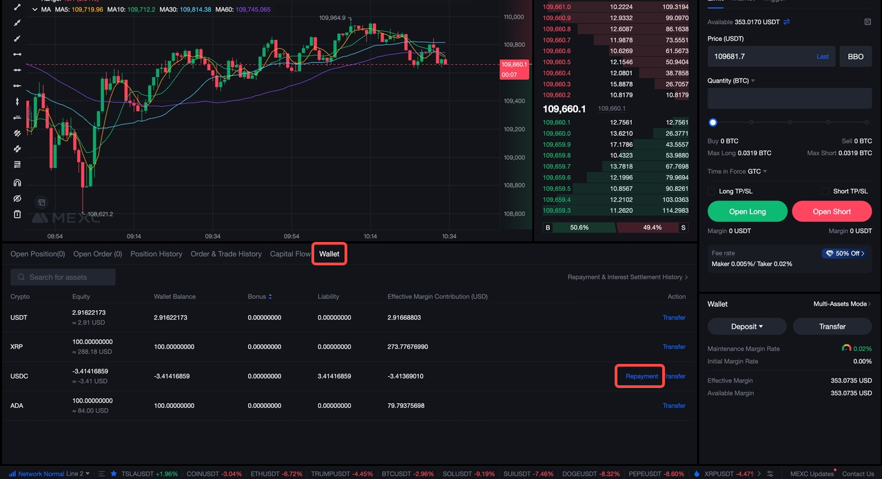Sa pahina ng Futures trading, mag-navigate sa seksyong Wallets at hanapin ang asset na may mga natitirang pananagutan. I-click ang Muling Pagbabayad.