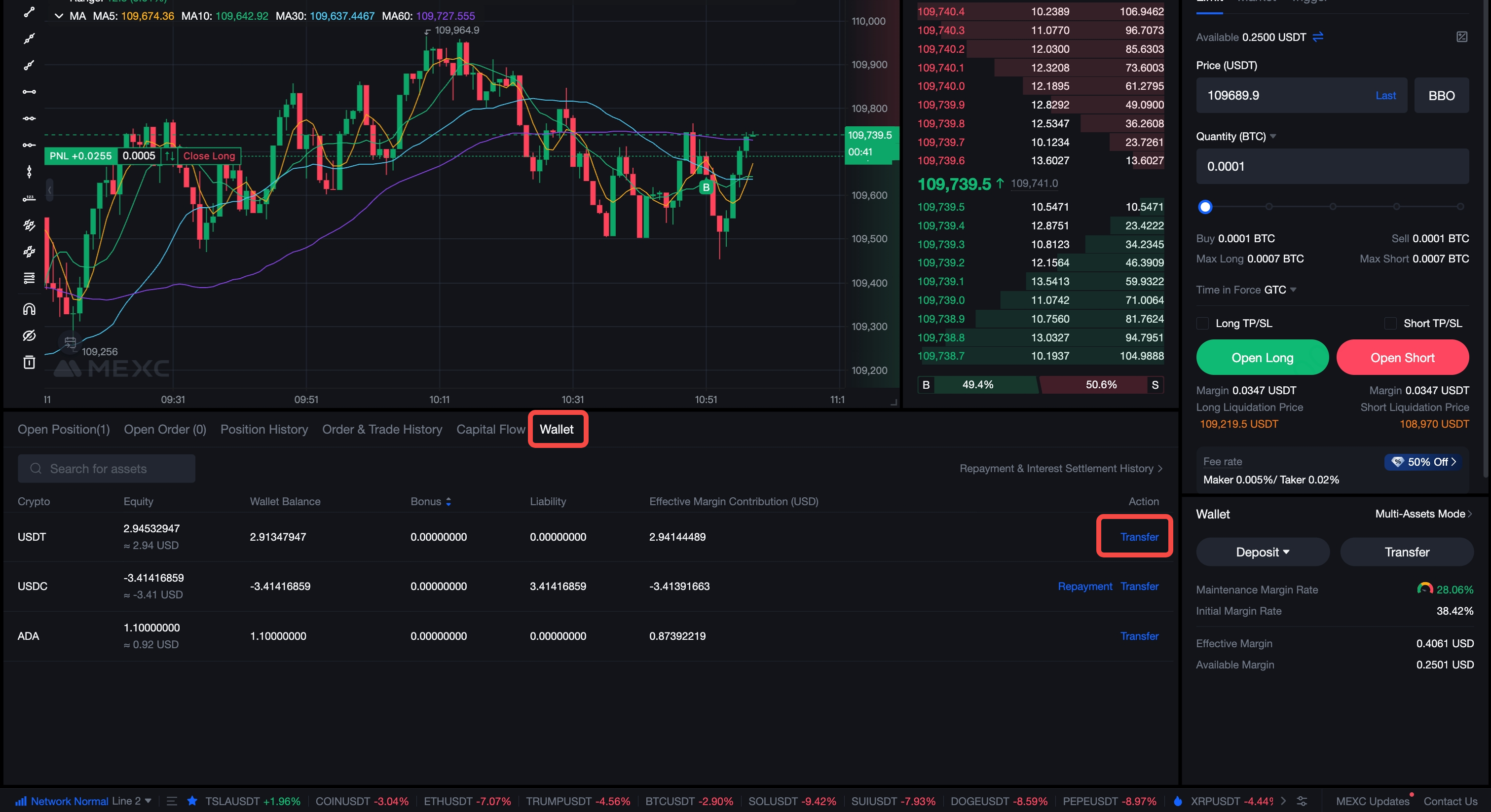 Bumalik sa pahina ng kalakalan sa Futures. Sa ilalim ng Wallet, i-click ang Paglipat at ilipat ang mga asset na gusto mong gamitin bilang collateral sa iyong Futures account. Ang mga ito ay magsisilbing shared margin sa Multi-Asset Mode.
