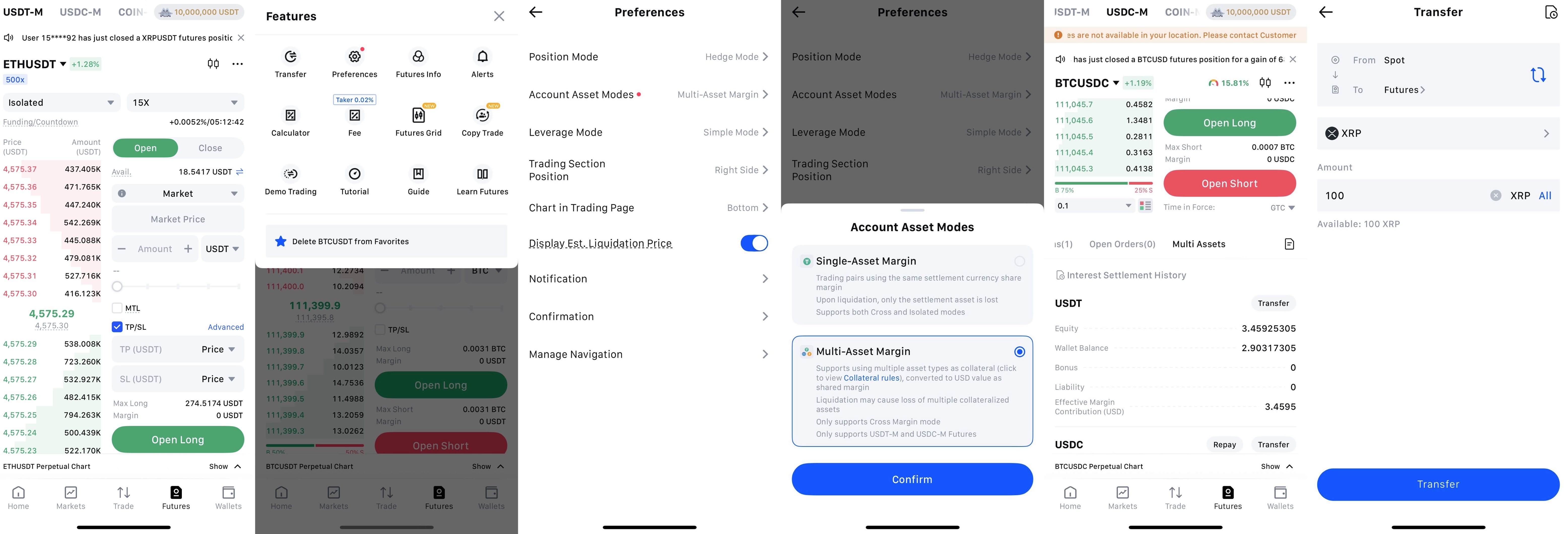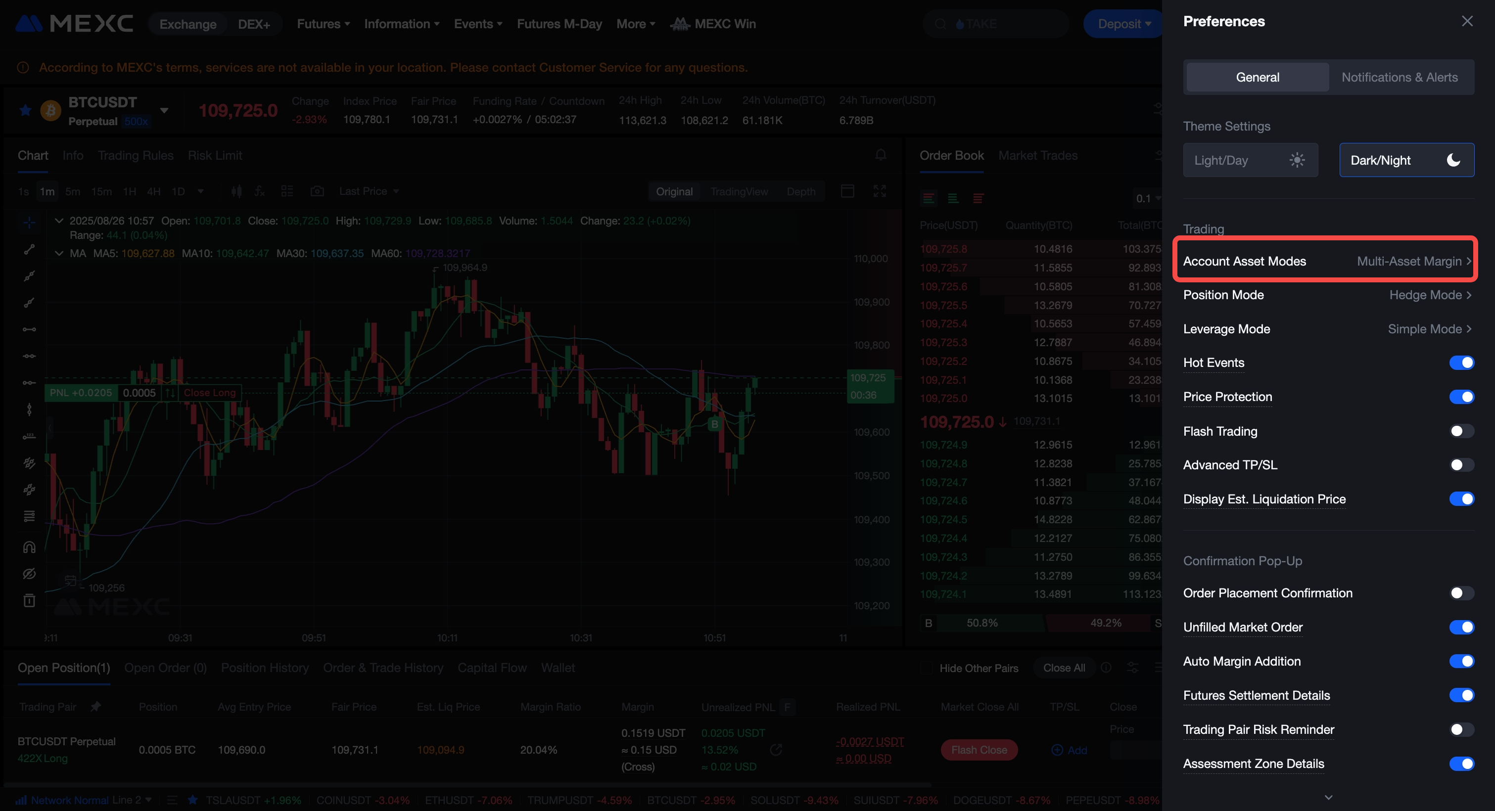I-click ang button na Mga Setting. Sa Mga Kagustuhan, piliin ang Account Asset Mode, at lumipat sa Multi-Asset Margin. Tandaan: Hindi ka makakapagpalit ng mga mode ng asset ng account kung mayroon ka pa ring mga bukas na posisyon, aktibong order, o hindi pa nababayarang pananagutan.