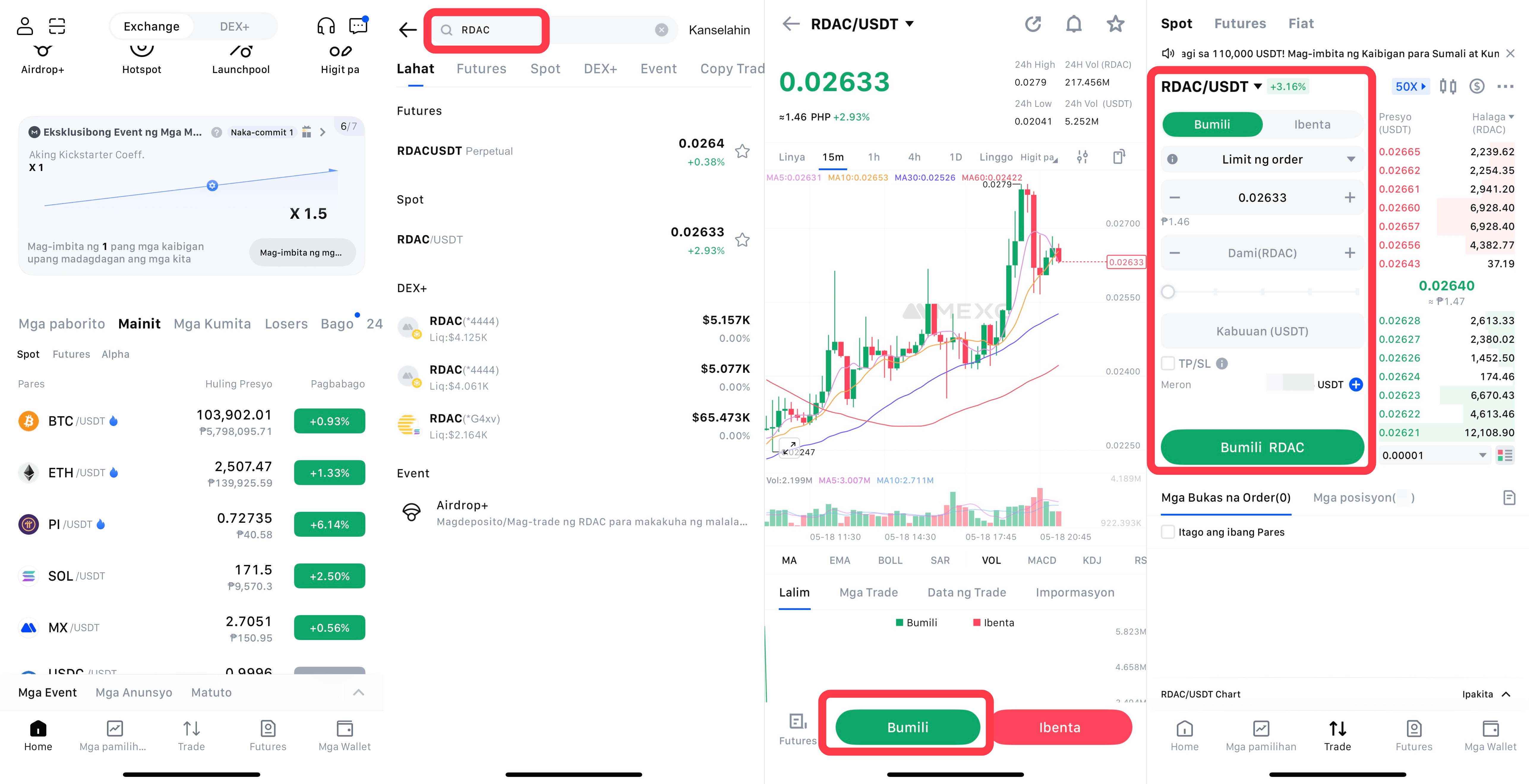 Sa kasalukuyan, nag-aalok ang MEXC ng RDAC sa parehong Spot at Futures market nito. Ang mga hakbang sa pangangalakal ay ang mga sumusunod: