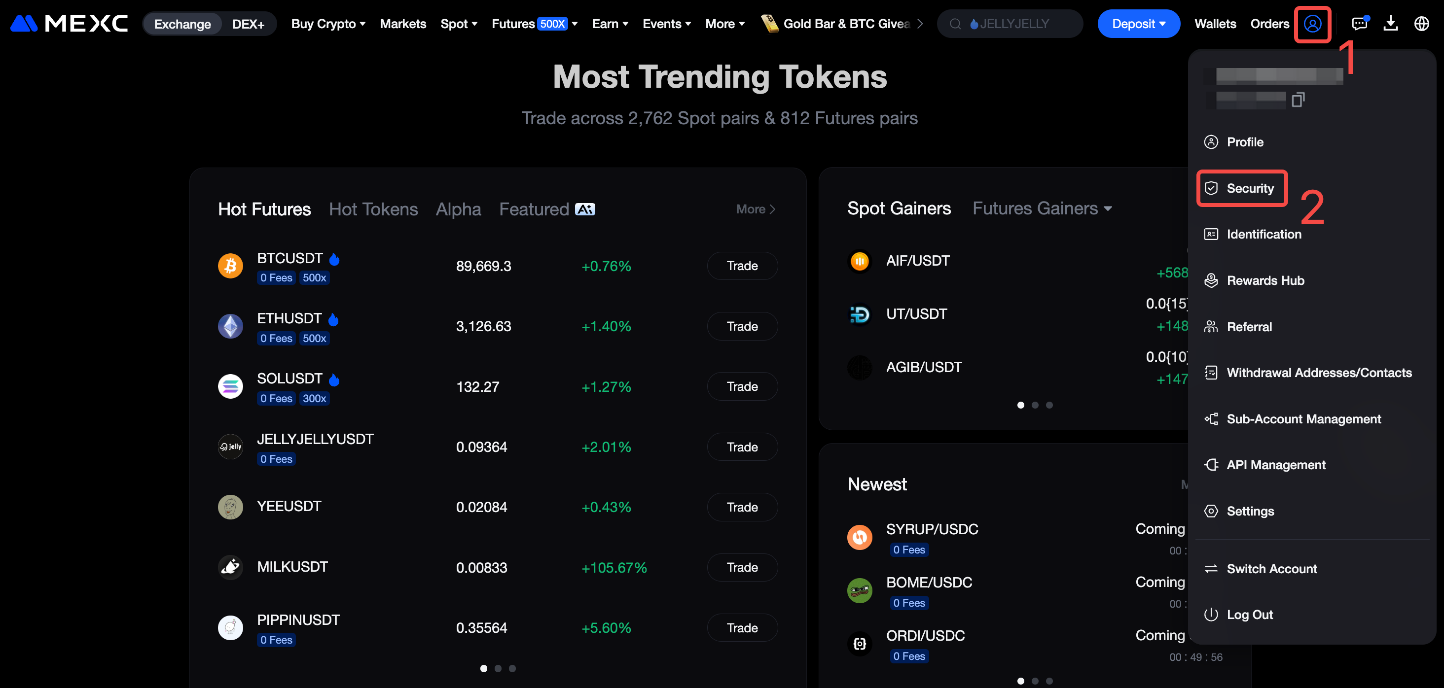 Pumunta sa opisyal na website ng MEXC at mag-log in sa iyong account. Sa homepage, buksan ang dropdown na menu sa ilalim ng iyong profile at piliin ang Seguridad.