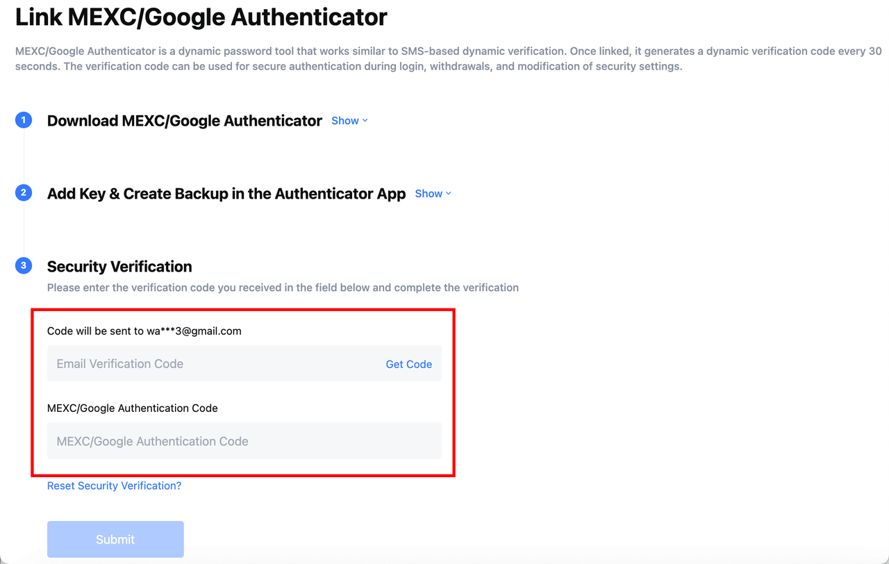 5) I-click ang Kunin ang Code, pagkatapos ay kunin at ilagay ang verification code na ipinadala sa naka-link na email address. Susunod, ilagay ang 6-digit na code na nabuo ng Google Authenticator. Pagkatapos mapunan ang parehong mga code, i-click ang Isumite upang makumpleto ang proseso ng pagli-link.