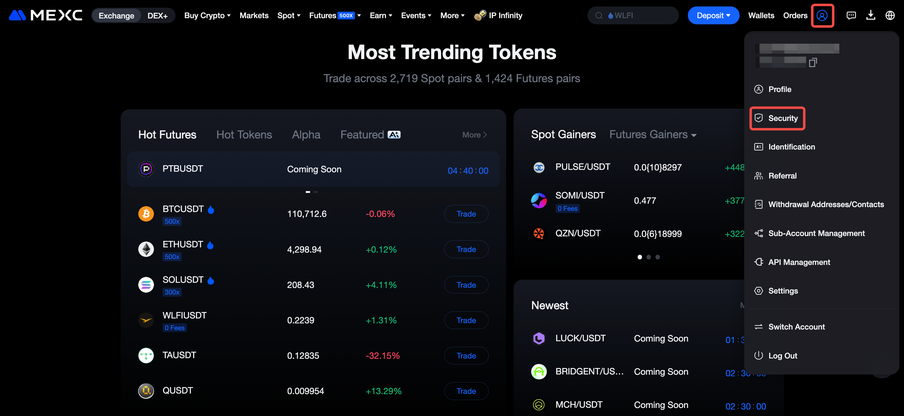 1) Bisitahin ang opisyal na website ng MEXC at mag-log in sa iyong account. Mula sa icon ng user, mag-navigate sa Seguridad.