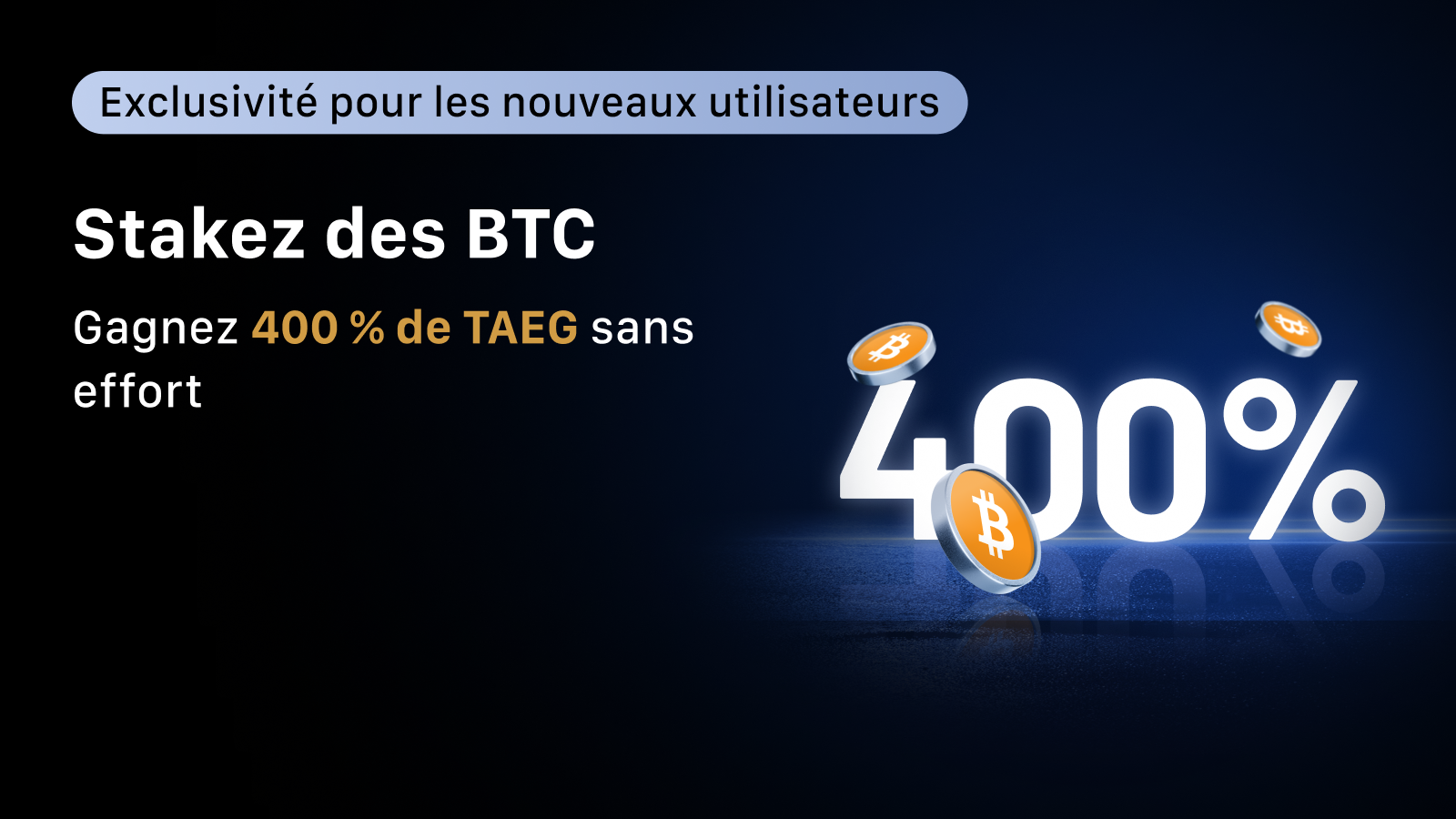 Le Gala de staking de BTC est désormais en ligne et accessible en exclusivité aux nouveaux utilisateurs. Stakez votre BTC dès aujourd'hui et profitez d'un TAEG exceptionnel de 400 %. Ne manquez pas cette opportunité rare !