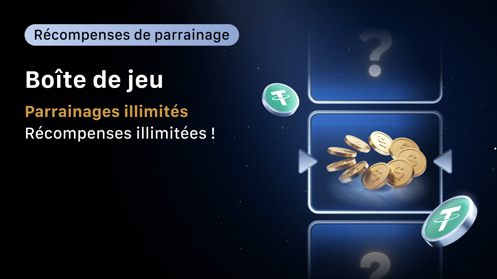 La Boîte de jeu de parrainage est de retour pour la Saison 8 — prolongez le plaisir avec une expérience toujours aussi amusante et gratifiante. Invitez vos amis, ouvrez votre boîte de jeu chanceuse et gagnez jusqu'à 100 USDT chacun — cumulez autant de récompenses que vous le souhaitez !