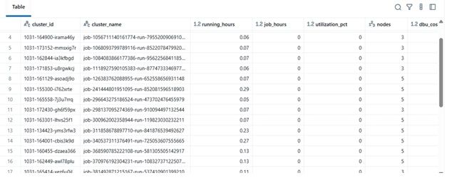 | cluster_name | running_hours | job_hours | utilization_pct | nodes | total_cost | |----|----|----|----|----|----| | etl-job-prod | 36.5 | 28.0 | 76.7% | 4 | $142.8 | | dev-debug | 12.0 | 1.2 | 10.0% | 2 | $18.4 | | nightly-adf | 48.0 | 45.0 | 93.7% | 6 | $260.4 |