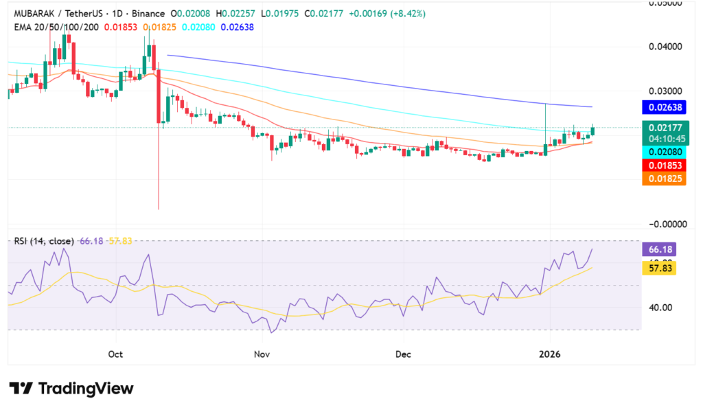 EMA मूल्यों ने प्रदर्शित किया कि कीमत अल्पावधि में महत्वपूर्ण ट्रेंड लाइनों से ऊपर थी। EMA 20, 0.01853 था, और EMA 50, 0.01825 था, जो वर्तमान बाजार मूल्य से कम था। EMA 100, 0.02080 था, जो कीमत से नीचे रहा और ऊपर की ओर ट्रेंड दिशा दिखाया। EMA 200, 0.02638 पर था, जो बाजार के ऊपर एक दीर्घकालिक प्रतिरोध क्षेत्र है।