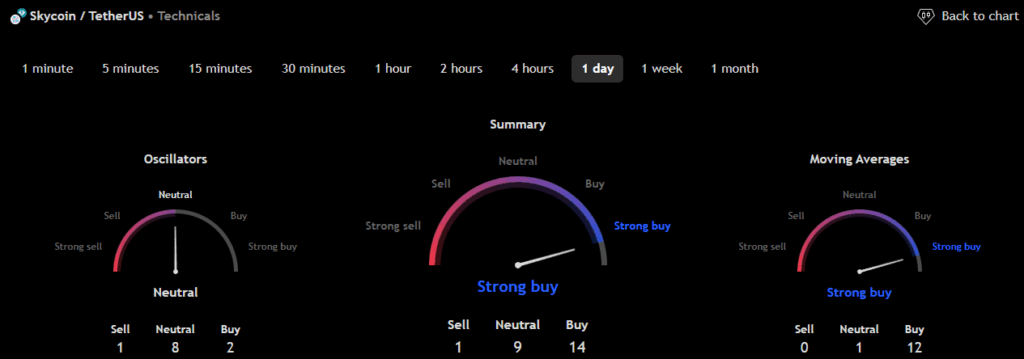 तकनीकी विश्लेषण संकेतक जैसे सापेक्ष वॉल्यूम (RVOL), मूविंग एवरेज (MA), और सापेक्ष शक्ति सूचकांक (RSI) Sky (SKY) के नीचे दिए गए चार्ट में दिखाए गए हैं।