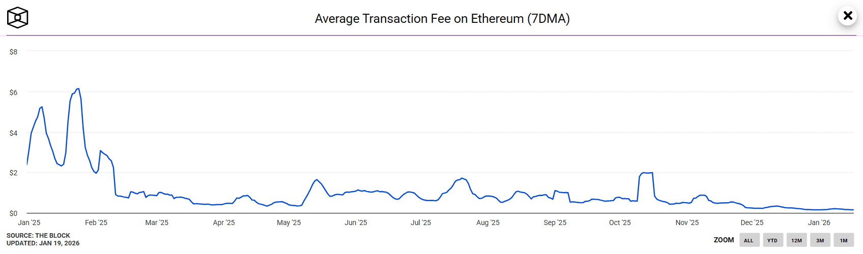 Ethereum नेटवर्क पर गैस शुल्क का 7DMA मेट्रिक। स्रोत: The Block.