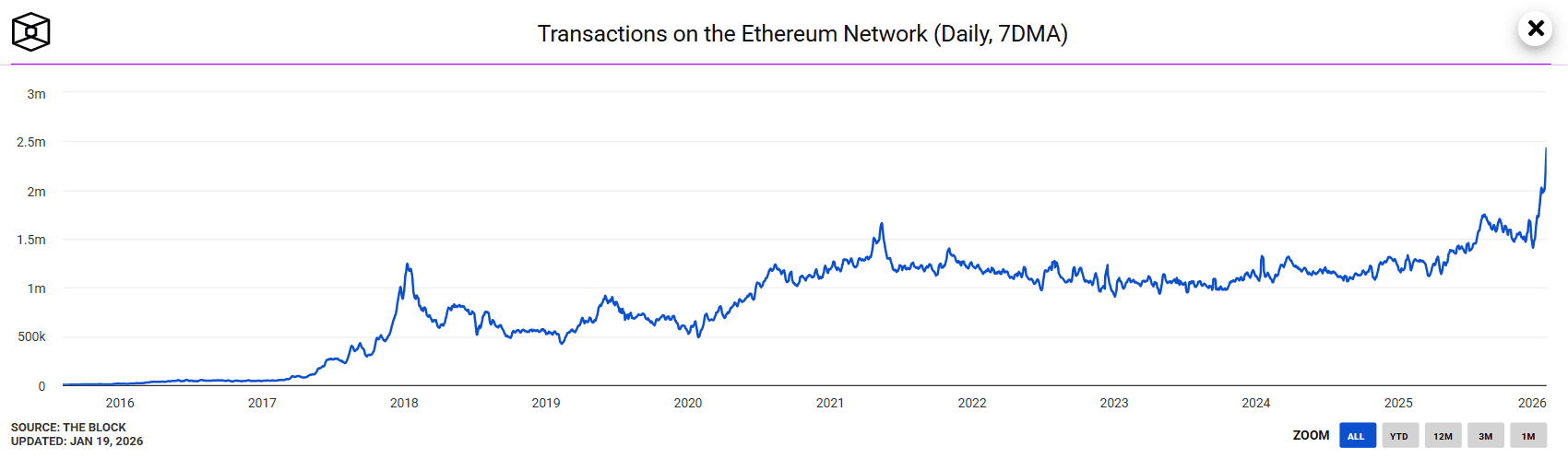 The Block के एक डैशबोर्ड के अनुसार, 17 जनवरी, 2025 को Ethereum नेटवर्क पर लेनदेन की संख्या का सात-दिवसीय चलती औसत (7DMA) 2.43 मिलियन तक पहुंच गया। यह एक नया सर्वकालिक उच्च स्तर है।