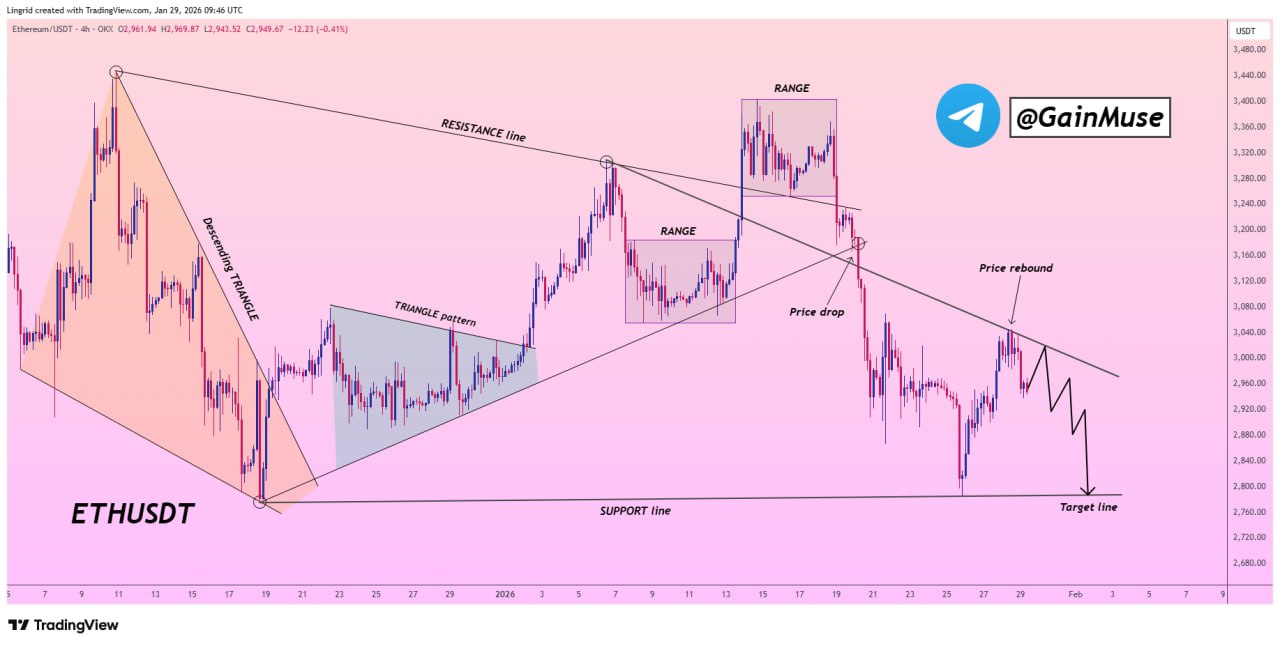 क्रिप्टो ट्रेडर GainMuse के संरचनात्मक दृष्टिकोण के अनुसार, Ethereum अभी भी एक प्रमुख अवरोही प्रतिरोध रेखा से नीचे ट्रेड कर रहा है जिसने पूर्व रेंज ब्रेकडाउन के बाद से डाउनट्रेंड को परिभाषित किया है।