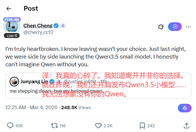Qwen टीम के सदस्य @cherry_cc12 के एक ट्वीट ने इस उथल-पुथल के हिमशैल का सिर्फ शीर्ष प्रकट किया। जैसे-जैसे आंतरिक बैठकों से जानकारी धीरे-धीरे लीक हुई, हमने इस सामूहिक निकास की पूरी तस्वीर जोड़ी।