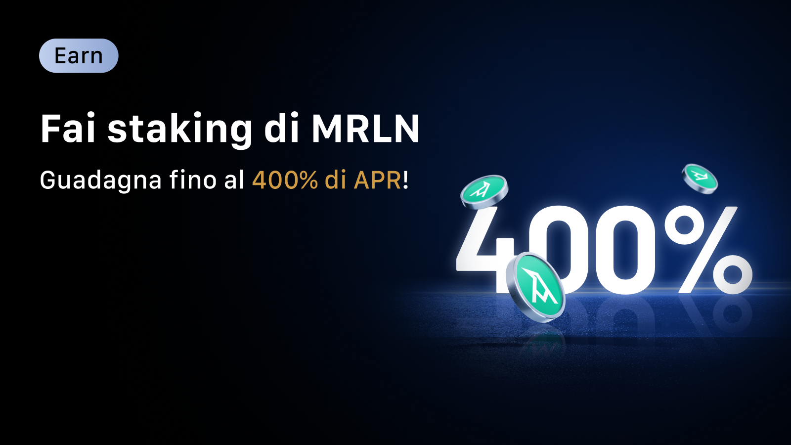 È ora di far lavorare di più le tue criptovalute! MEXC è orgogliosa di presentare l'evento Fai staking per guadagnare MRLN, un'opportunità limitata nel tempo per guadagnare fino al 400% APR semplicemente effettuando lo staking di MRLN.