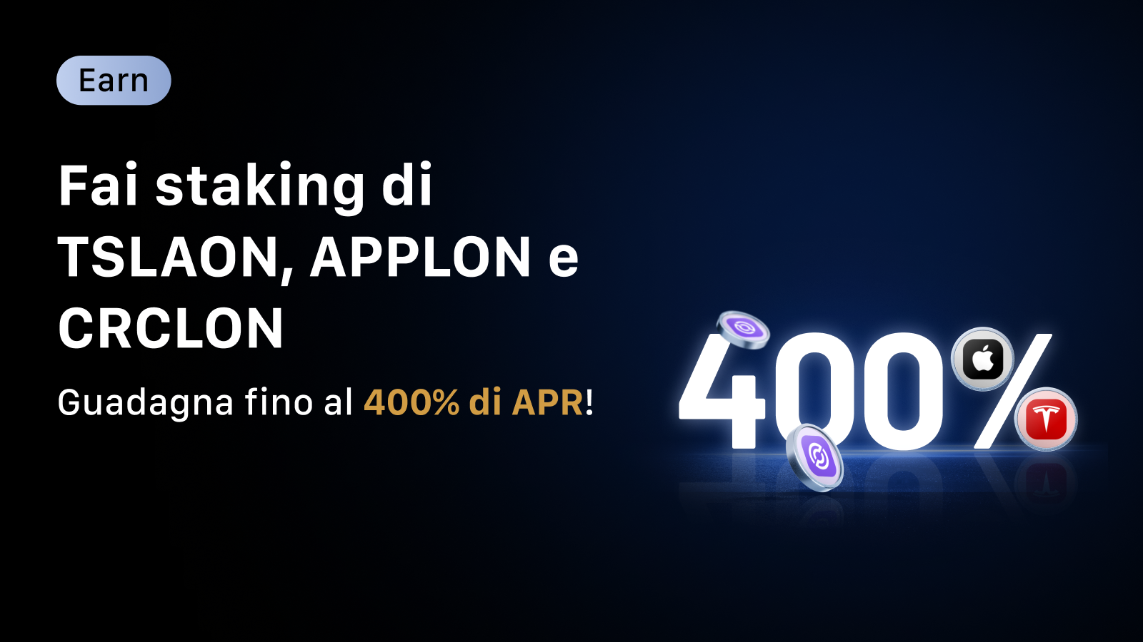 L'ultimo Gala di staking è ora disponibile, esclusivamente per i nuovi utenti e per un periodo limitato. Fai staking oggi stesso dei tuoi TSLAON, AAPLON e CRCLON per ottenere un notevole APR del 400%. Non perdere questa opportunità unica!